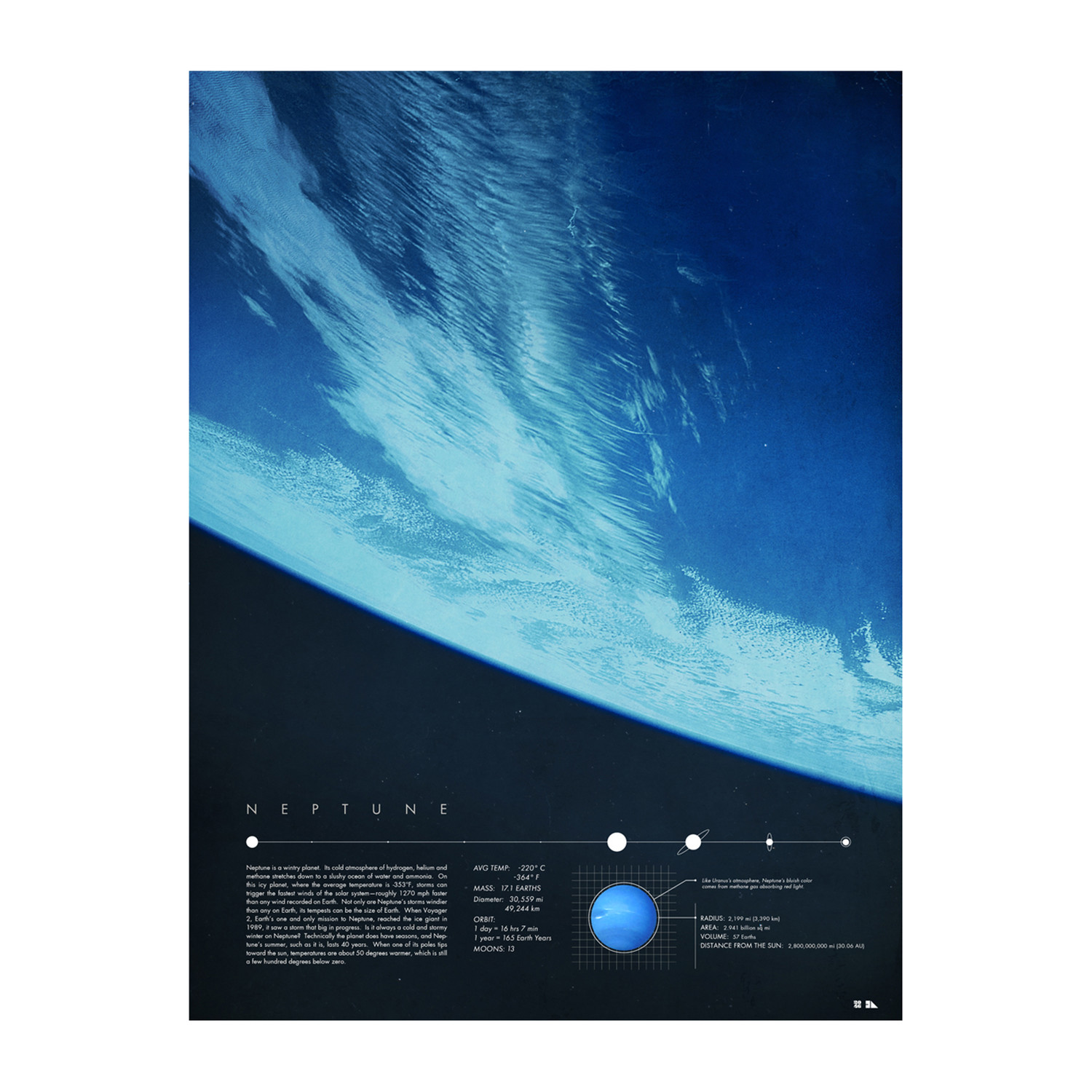 Neptune is a wintry planet. Its cold atmosphere of hydrogen, helium, and methane stretches down to a slushy, partially-frozen ammonia ocean. On this icy planet, where the average temperature is -353°F, storms can trigger the fastest winds of the solar system—roughly 1270 mph faster than any wind ever recorded on Earth. Neptune's storms can even be bigger than the Earth itself.