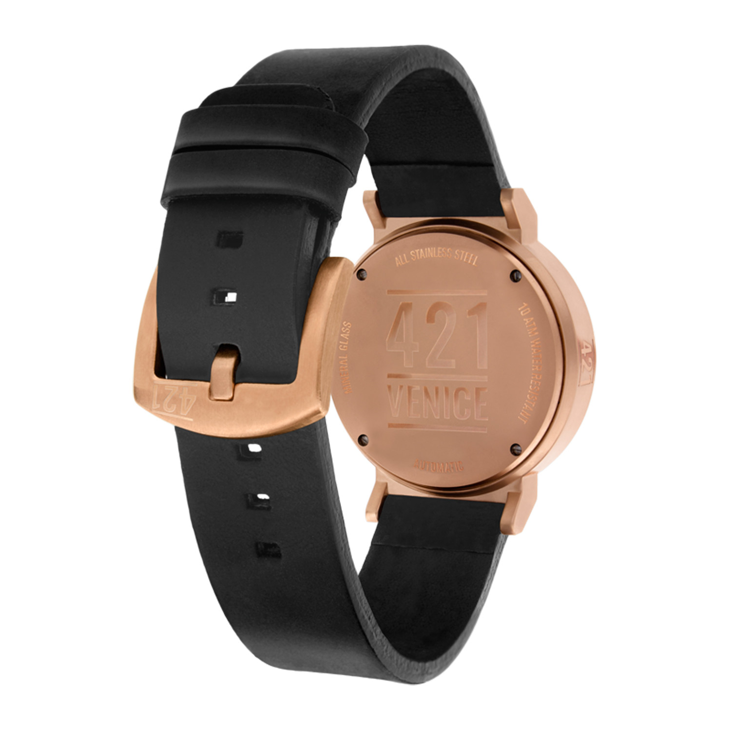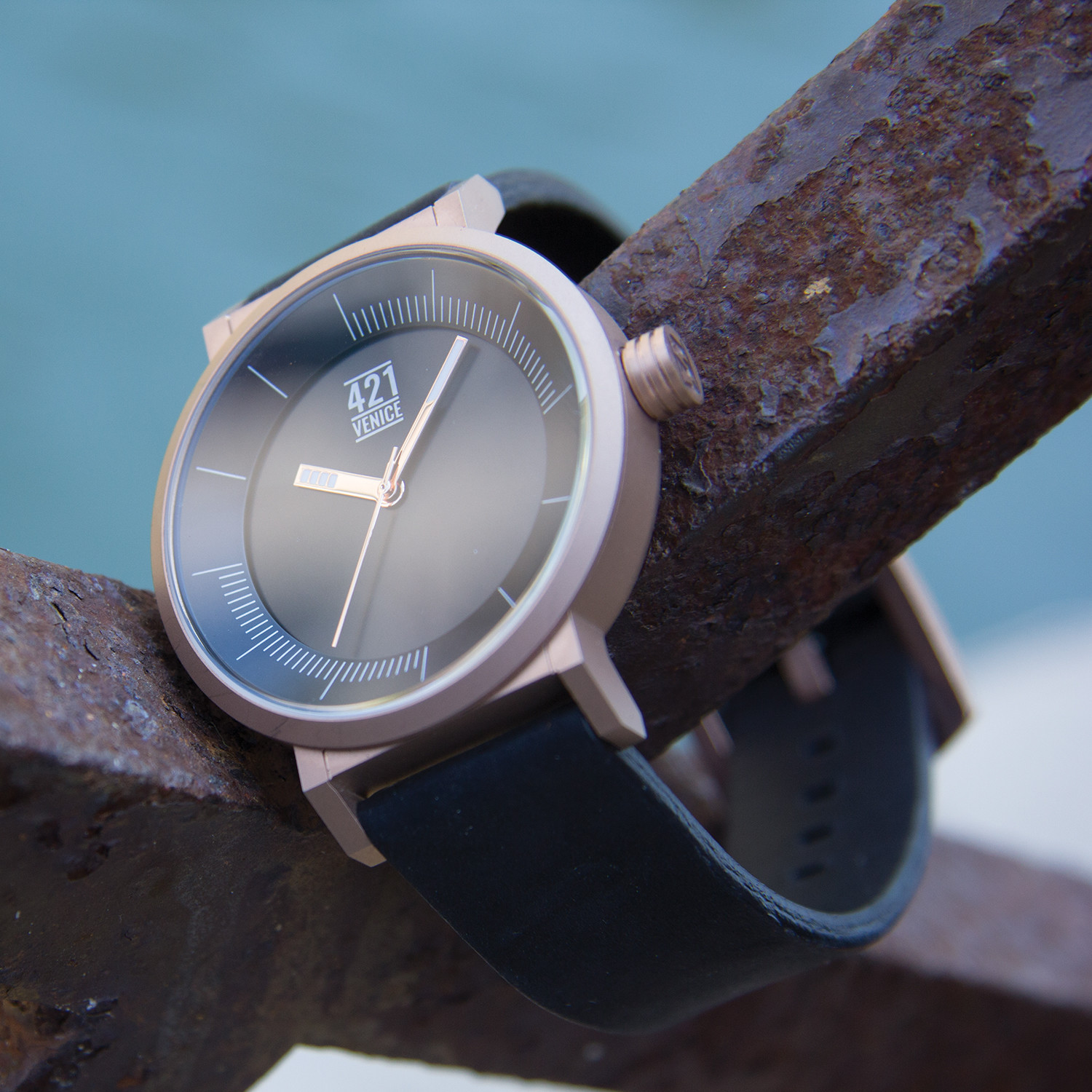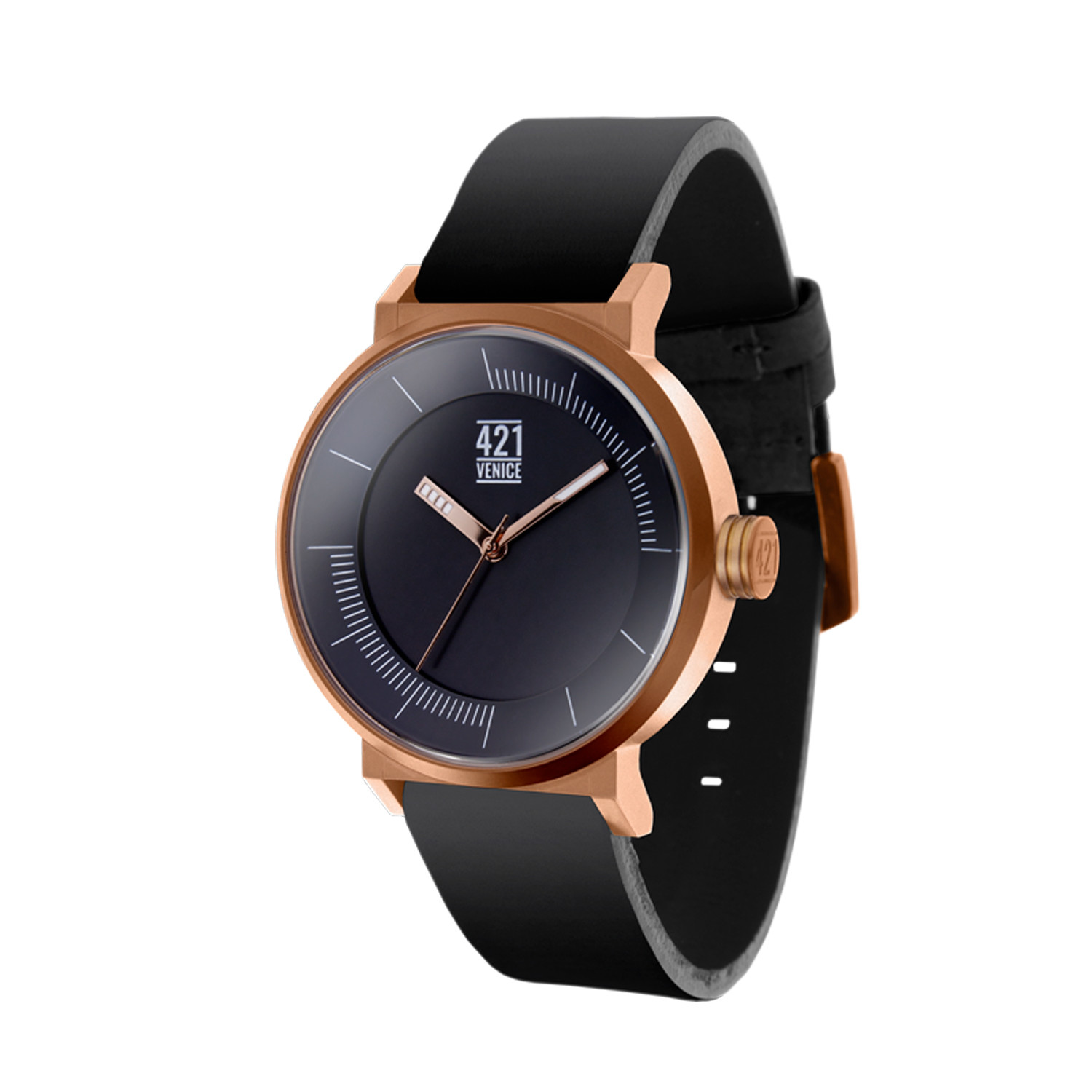 Venice is known across the globe as the "city on the water", slowly sinking, and surrounded by ancient buildings and some of the world's most amazing views. The founders of 421 Venice love the history of their hometown, but are still looking to the future. Which is why they created a collection of watches that deliberately rebuke the perpetually sought-after "vintage look", but still preserve the colors of the region - literally. The rose gold of the famous statues, the bronze of the Byzantine mosaics, the blue of the lagoon, the silver of the bridges, or the black of the night can be found in each timepiece, which is named for an area of Venice.