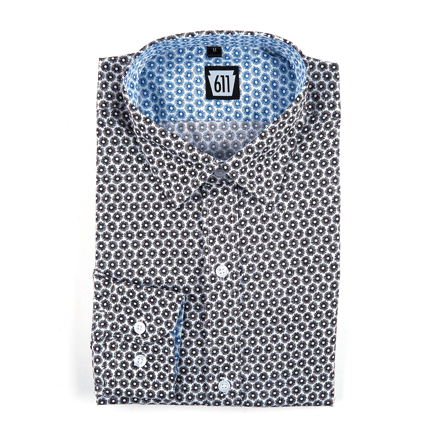 The Starburst Shirt is for those bursting with energy and style. This white collared shirt is decorated with a blue and black starburst pattern that is both bold and memorable, while still suitable for those with a more classic taste.