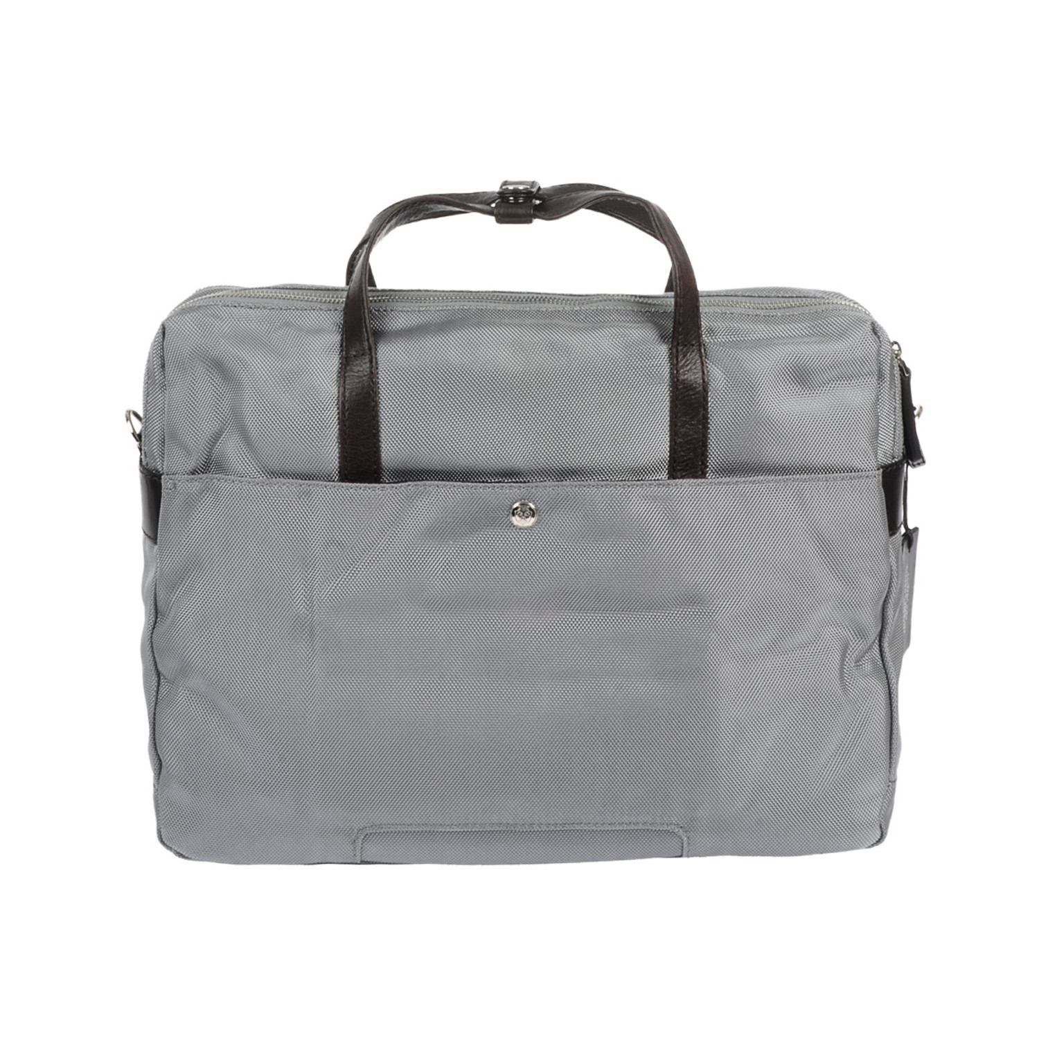 — Dual zippers for two separate compartments, one with a slot for computer and zip pocket and logo visible