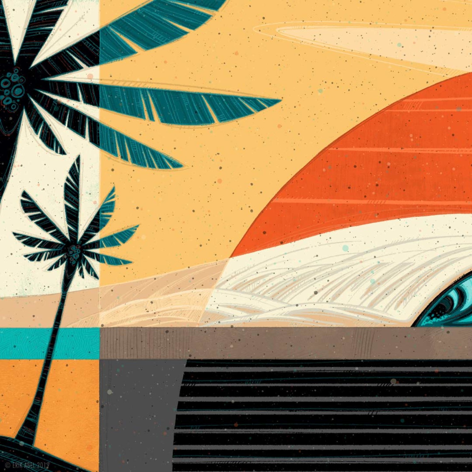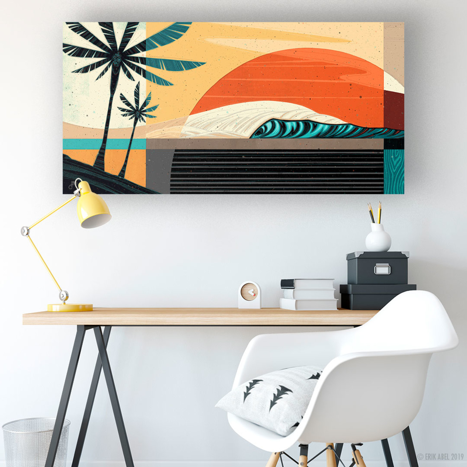 Bold colors, geometric patterns, and botanical profiles abound in this collection of canvas prints from Erik Abel. Inspired by a love of the ocean, surfing, and travel, Abel’s work articulates the spirit of the water and awe of nature. His graphic imagery unfolds along with the story of his paintings. Accents peek through, unexpectedly revealing layers of color while loose strokes of colored pencil create detail and dimension. Abel now lives and works in Southern Oregon. His original pieces have been featured in galleries across the country and abroad while his commercial work has attracted clients including Patagonia, Reef, REI and Billabong.