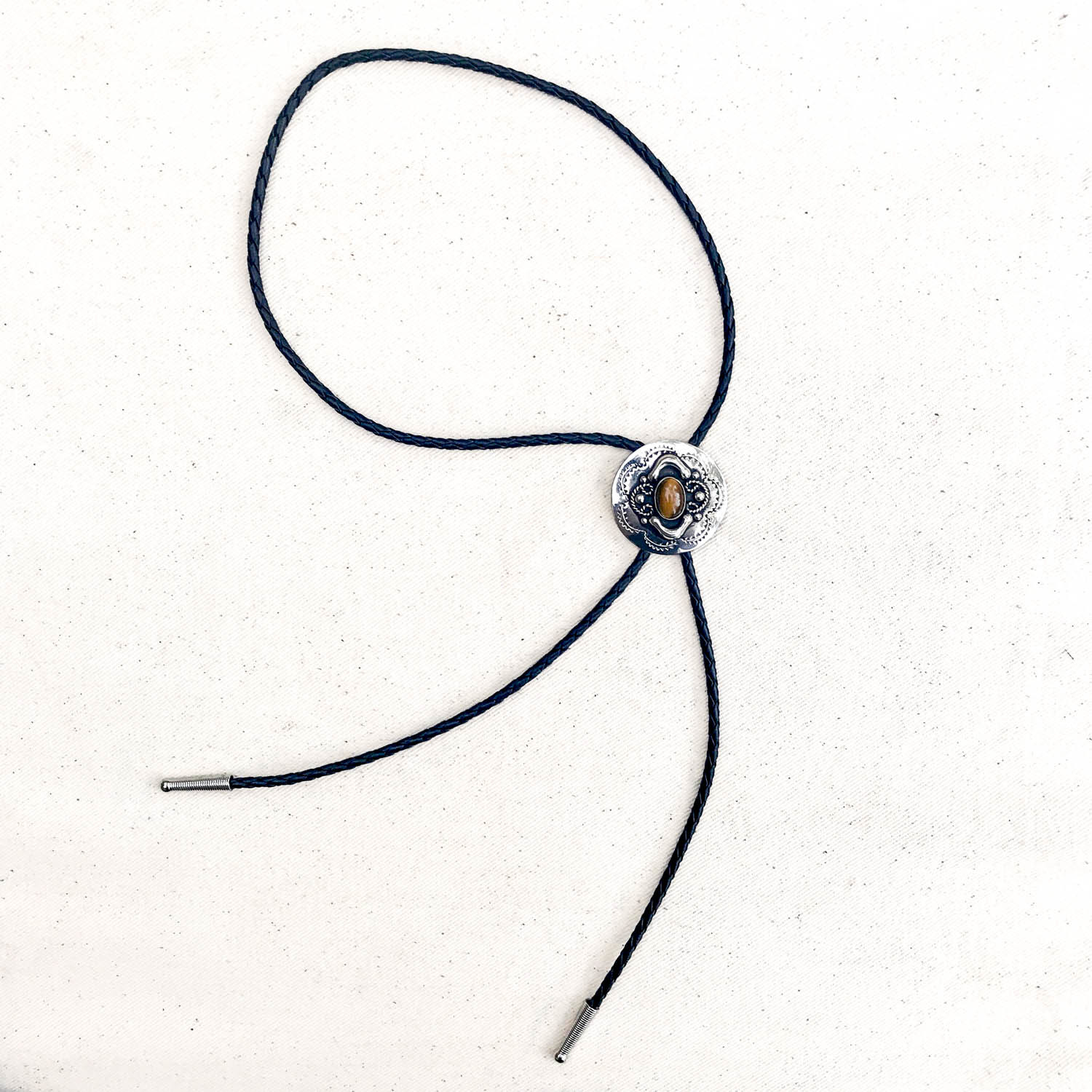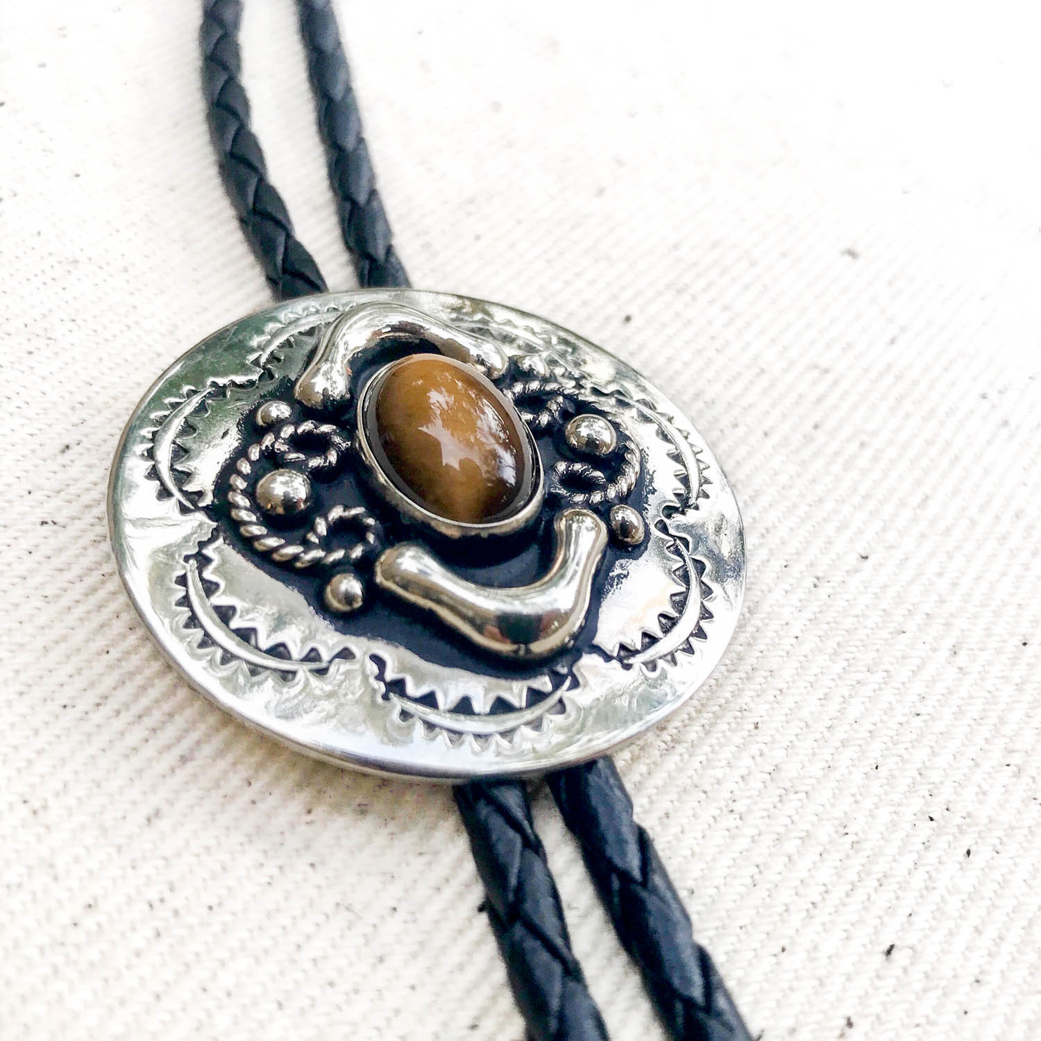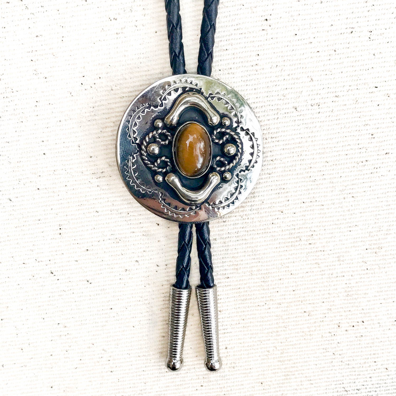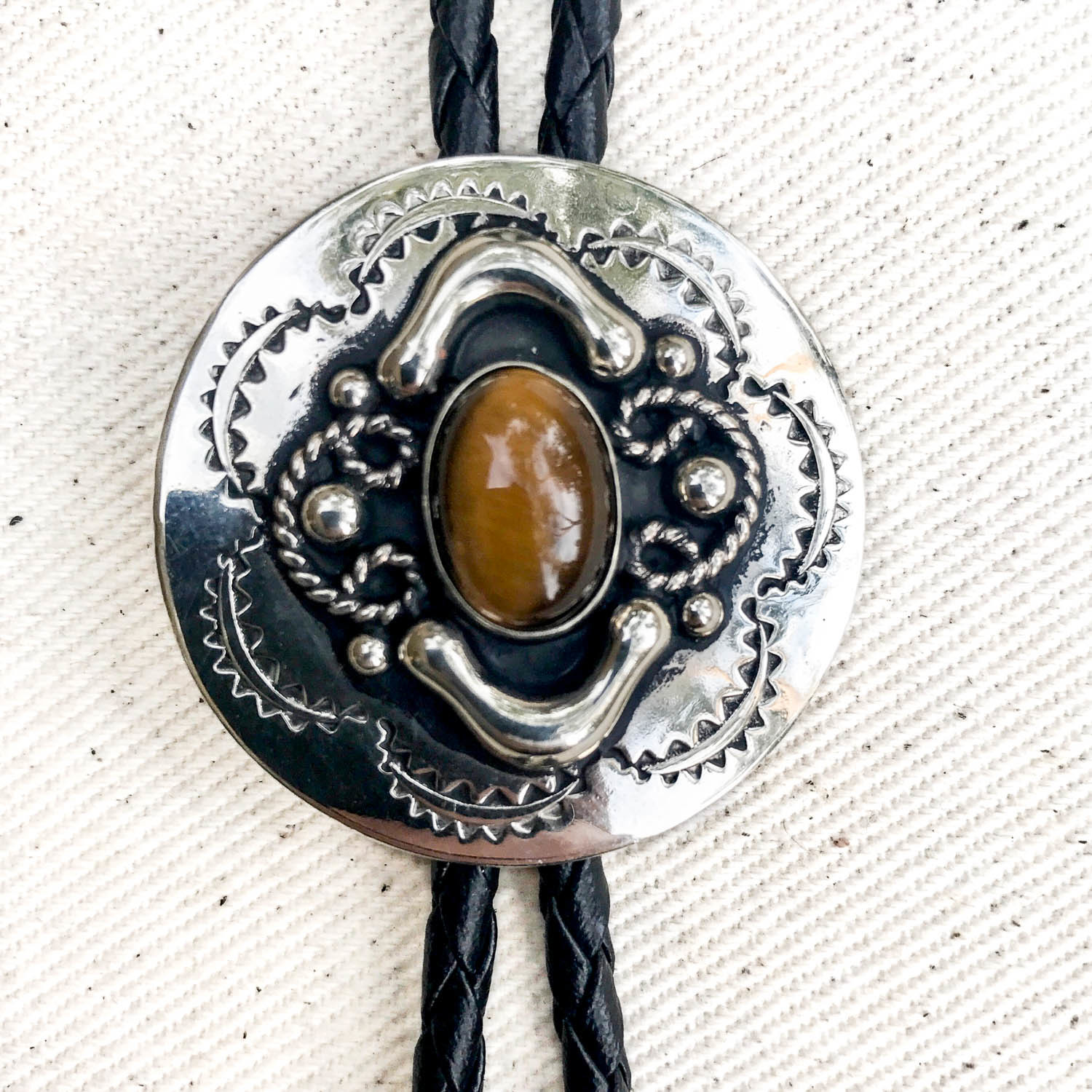The EL TIGRE is a detailed, concho style bolo tie made of genuine Alpaca silver and centered with the beautiful, golden-brown glow of a faux Tiger’s Eye cabochon. Perfect for that subtle, yet mysterious vibe.