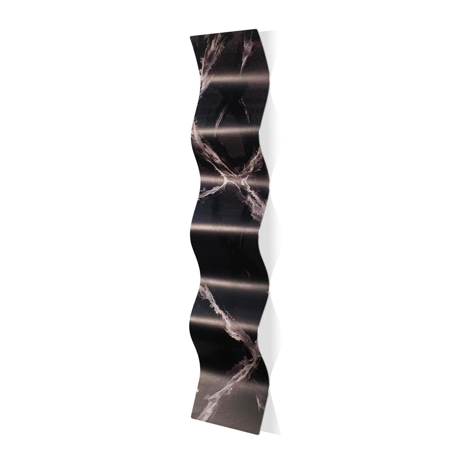 Black + White Wave is a contemporary style wall sculpture, formed in soothing waves and crafted from high-grade, rust-proof aluminum for a lightweight body and indoor/outdoor versatility. This flowing accent piece ripples like a ribbon in motion, and features the brilliant work of artist Mendo Vasilevski applied directly to the metallic surface in crisp hues with an artistic matte finish. It is designed to be a unique, dimensional way of decorating with an eclectic focus. The industrial materials and durable finishes make this wavy metal art a popular choice for everything from upscale hotels to harmonious day spas to modern corporate offices. This curved abstract artwork is a creative addition to any interior style.