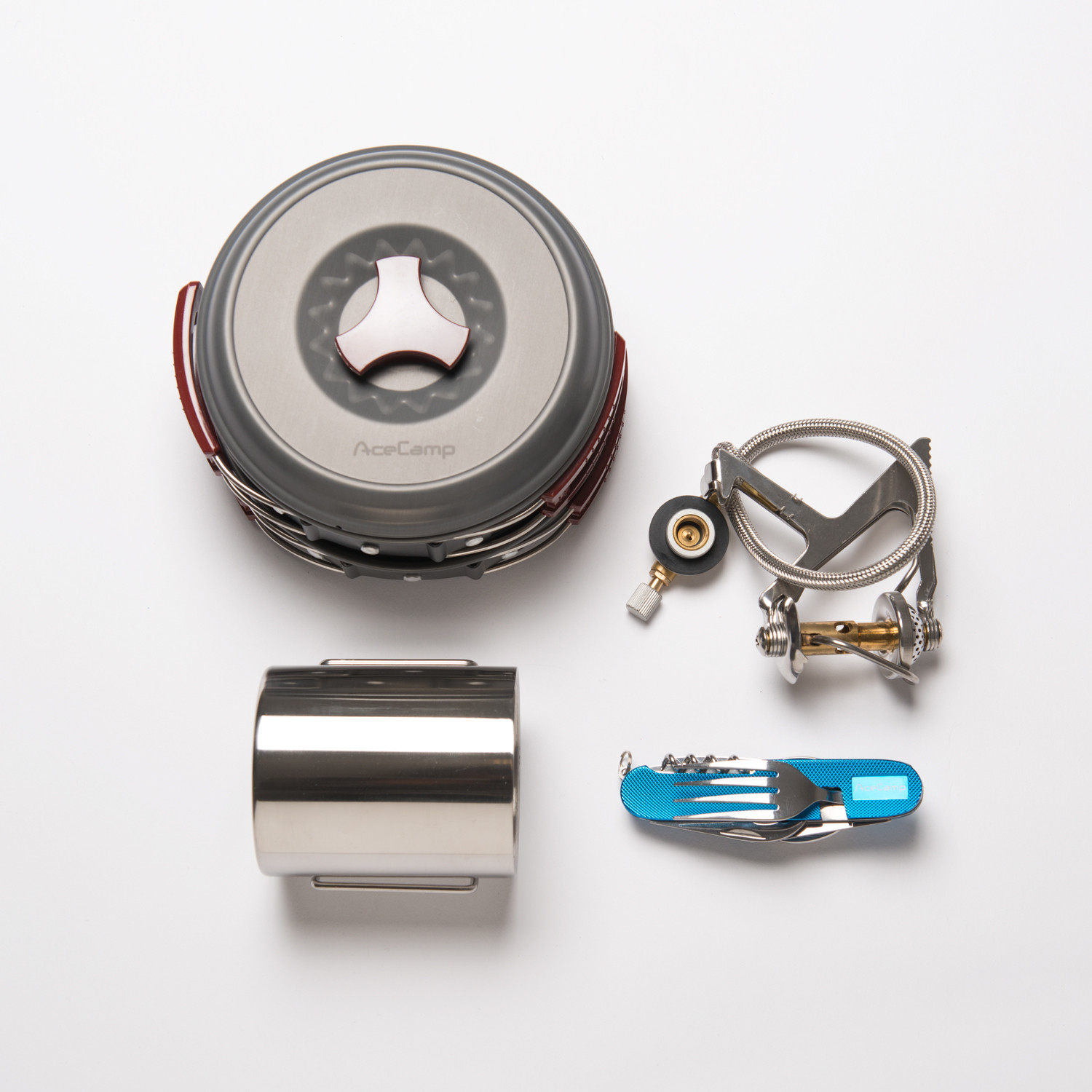 — Contains 1 pot with lid 150 mm, 0.75 L, 1 Pan 155 mm, 1 Foldable ladle, 1 Melamine Spoon, 2 Melamine bowls, 1 mesh bag
