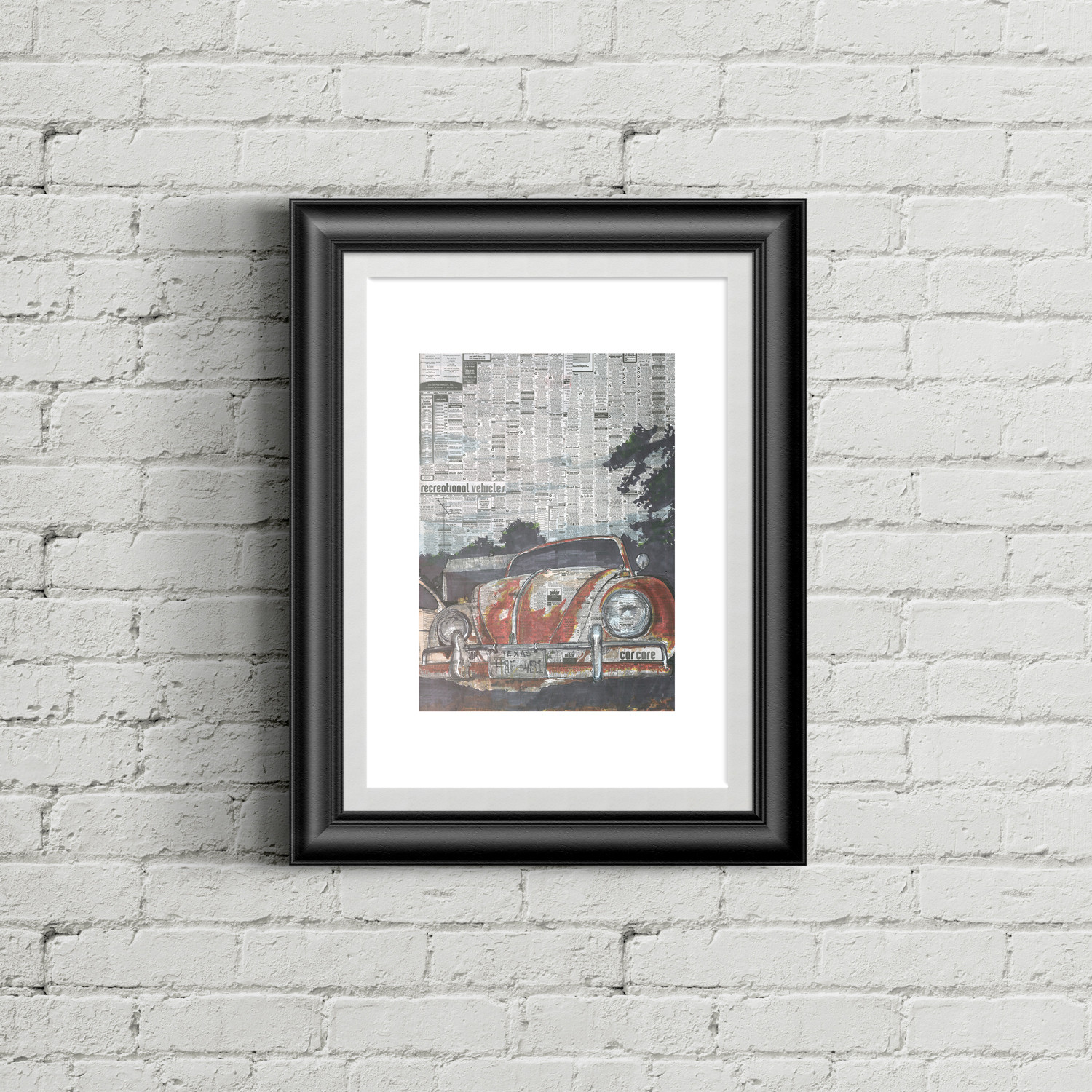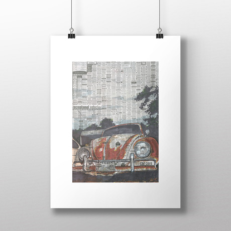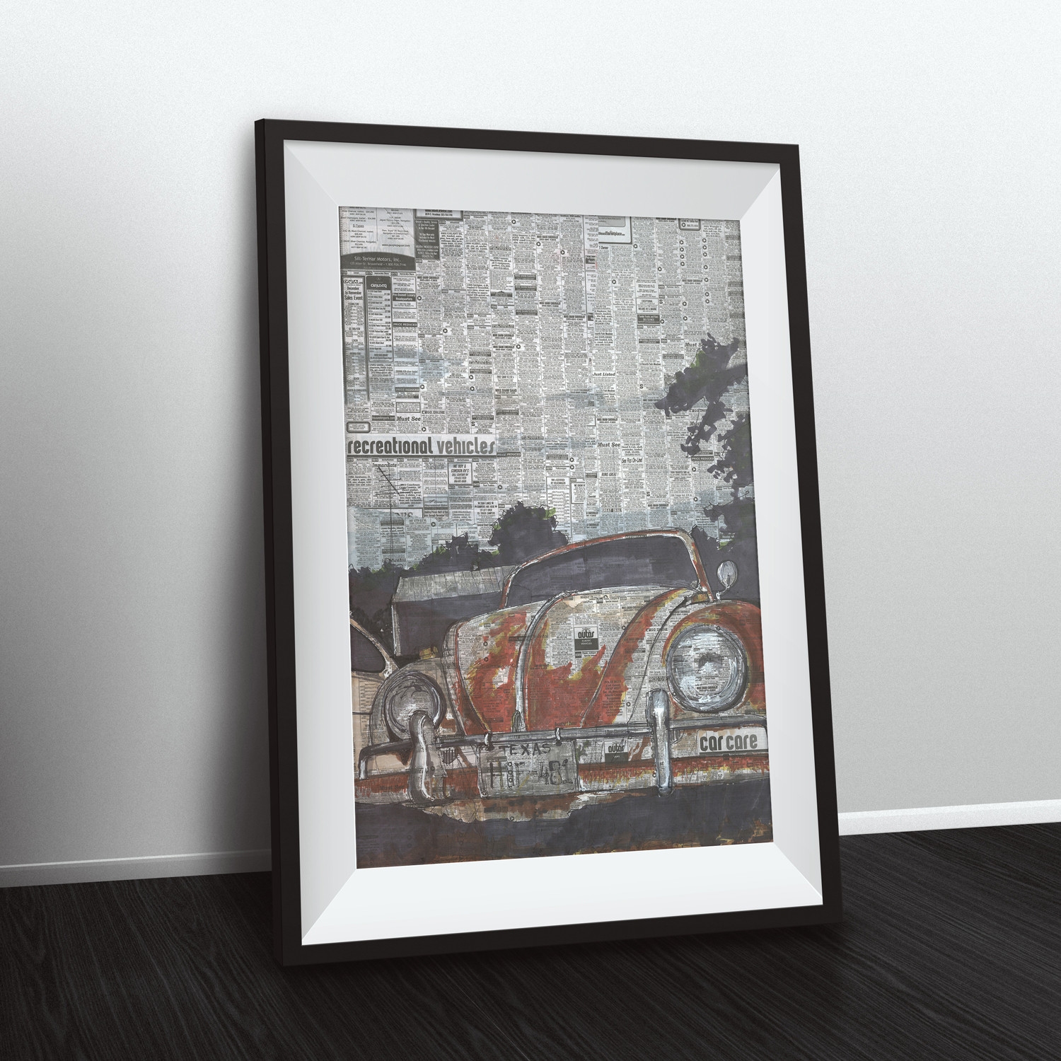 Inspired by the urban landscape, Adam Ambro’s work looks to find beauty in less than obvious places. Beginning with a recycled canvas of newspaper, Beetle #1 is a poster print of an original combination of pen, marker and whatever else happened to be within arm’s reach. The end result is a highly textured, imperfect interpretation of the man-made environment. This high quality poster print comes with a matte border for easy framing of this automotive art.
