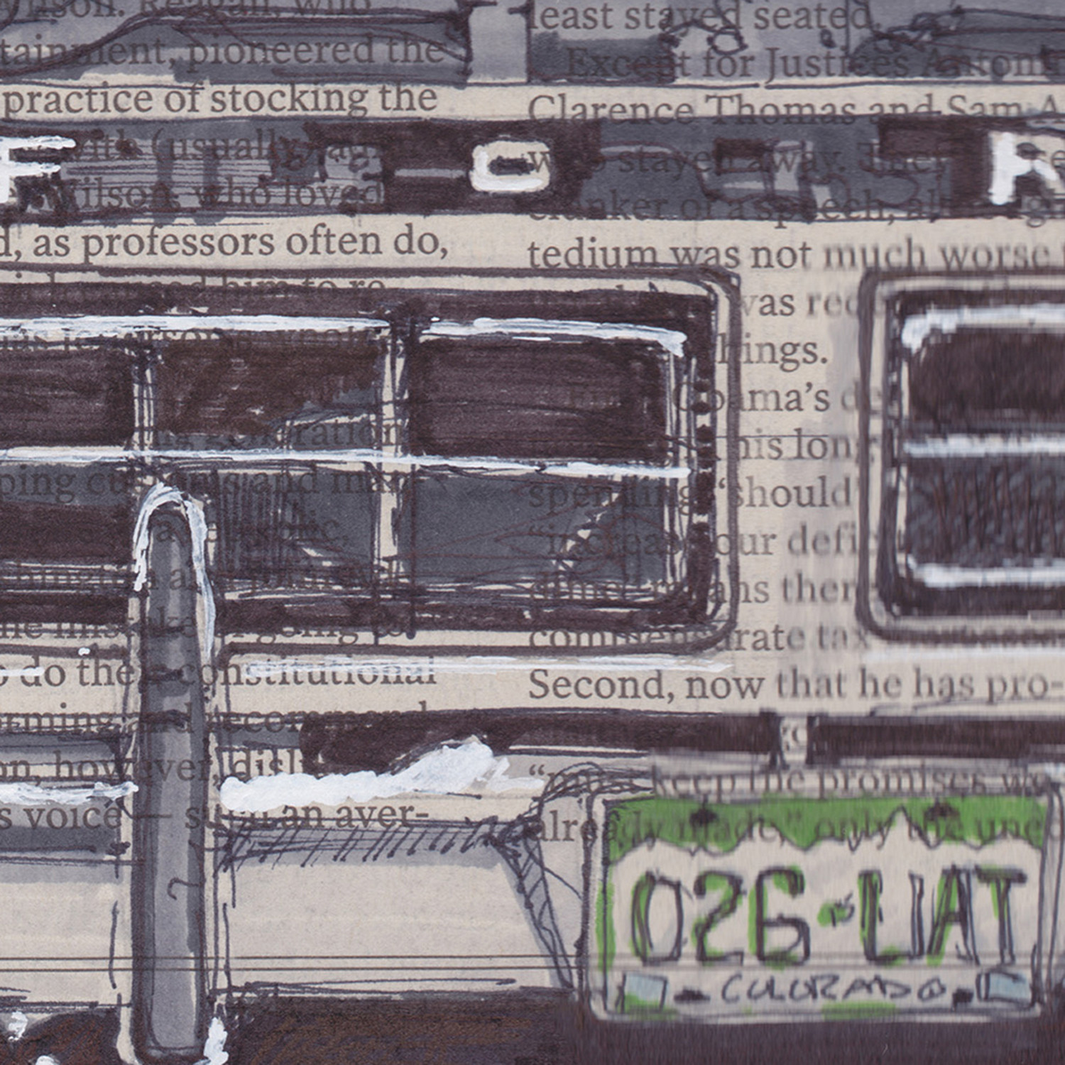Inspired by the urban landscape, Adam Ambro’s work looks to find beauty in less than obvious places. Beginning with a recycled canvas of newspaper, Ford #1 is a poster print of an original combination of pen, marker and whatever else happened to be within arm’s reach. The end result is a highly textured, imperfect interpretation of the man-made environment. This high quality poster print comes with a matte border for easy framing of this automotive art.