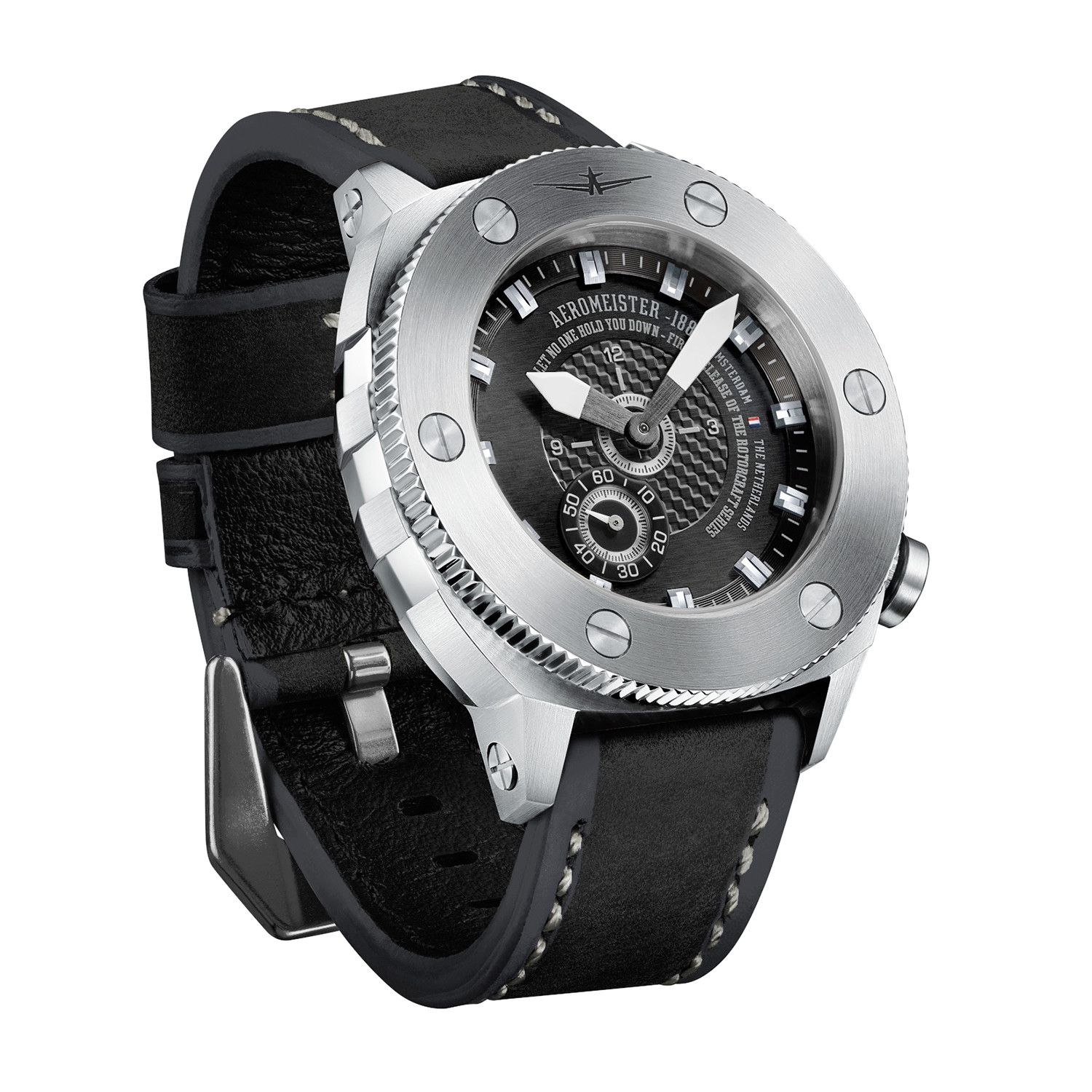 The Aeromeister Rotorcraft Quartz is a high-end pilot watch with a high quality Seiko movement. In a solid stainless steel case, its details include a handmade vintage leather strap and a large stainless steel buckle. Various accents on the case and logo on the case as well as the crown complete the look with high-end elegance.