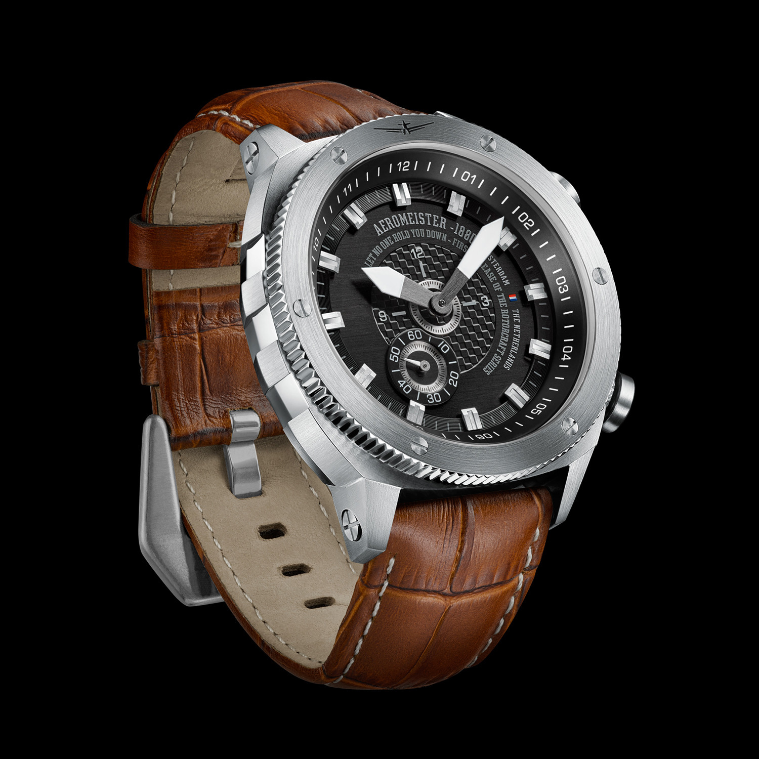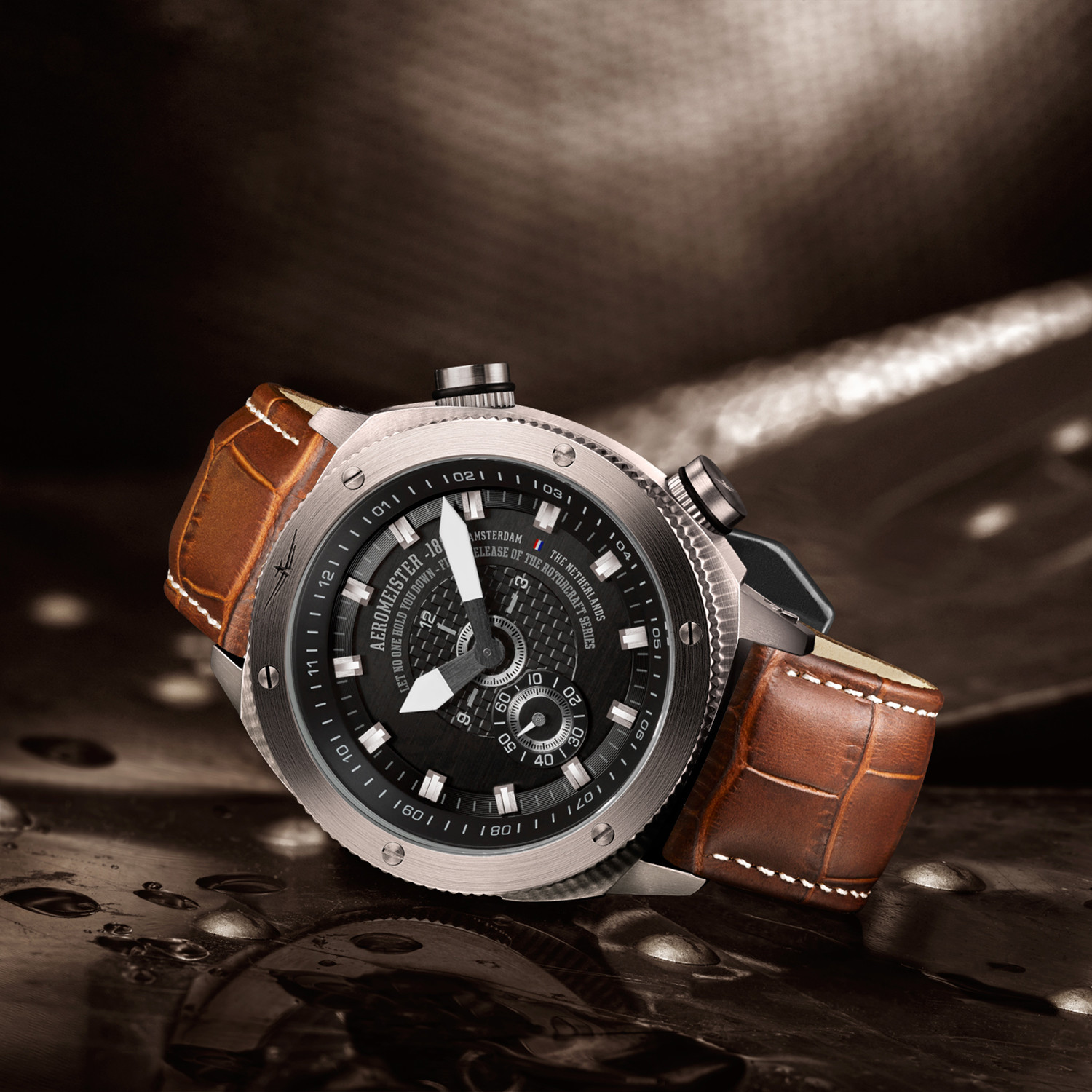 The Aeromeister Rotorcraft Quartz is a high-end pilot watch with a high quality Seiko movement. In a solid stainless steel case, its details include a cognac crocodile leather strap and a large stainless steel buckle. Various accents on the case and logo on the case as well as the crown complete the look with high-end elegance.