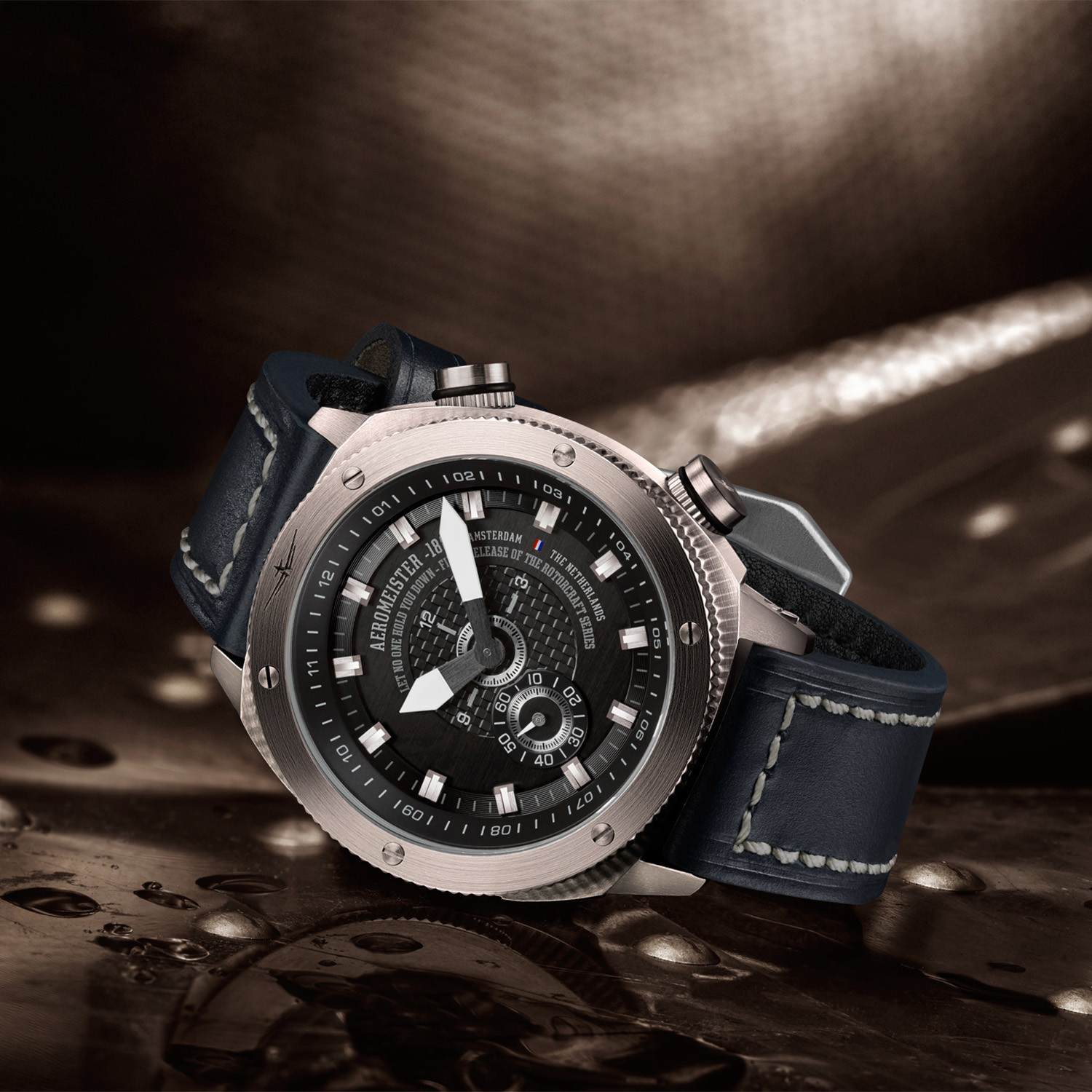 The Aeromeister Rotorcraft Quartz is a high-end pilot watch with a high quality Seiko movement. In a solid stainless steel case, its details include a handmade vintage leather strap and a large stainless steel buckle. Various accents on the case and logo on the case as well as the crown complete the look with high-end elegance.