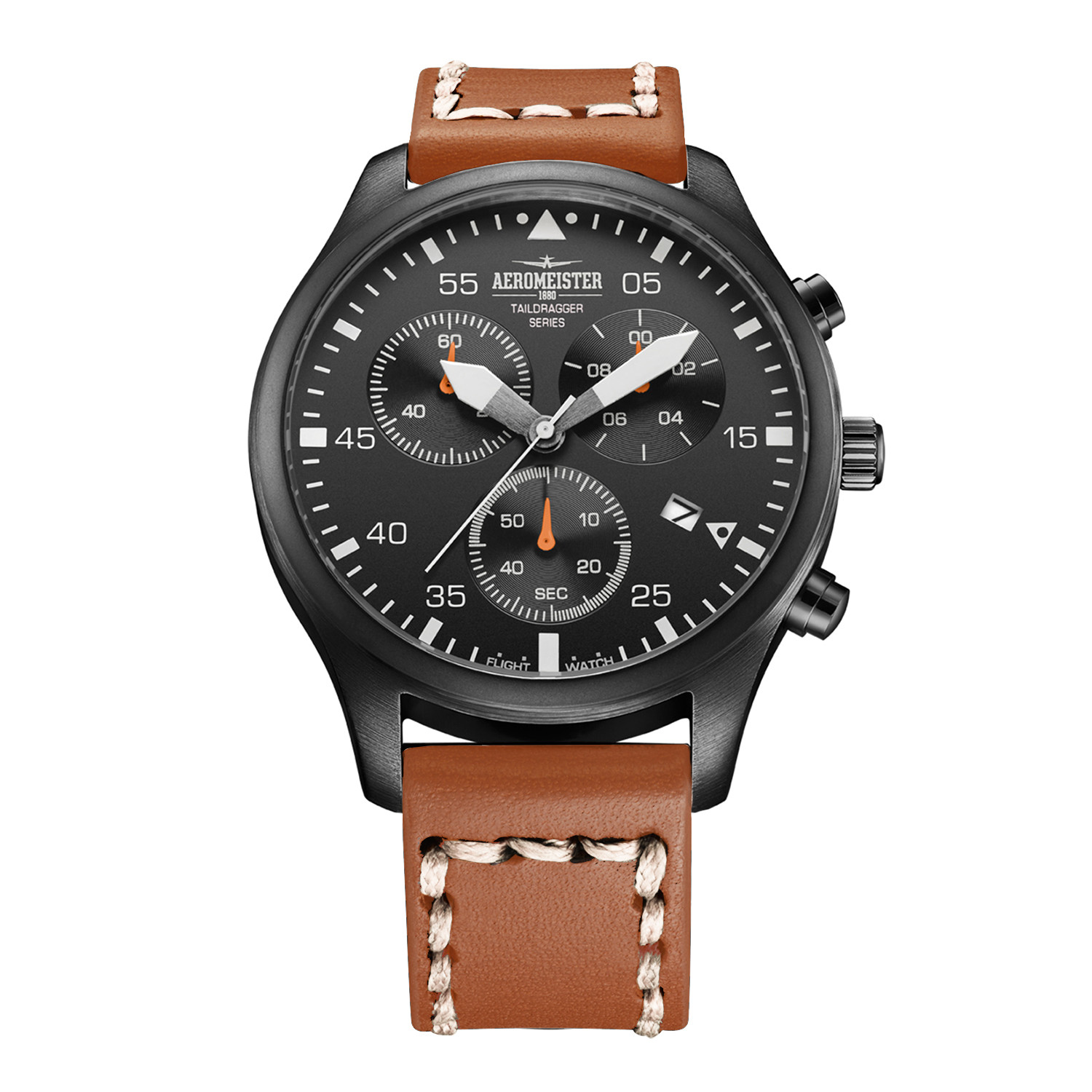 The Aeromeister Taildragger Quartz is a high quality men's pilot chronograph watch with an excellent Miyota 1/20 second chronograph. Its black stainless steel case sits on a brown handmade vintage leather strap with thick orange stitching and a large stainless steel buckle. Orange accents complete the look of this aviation-inspired essential.