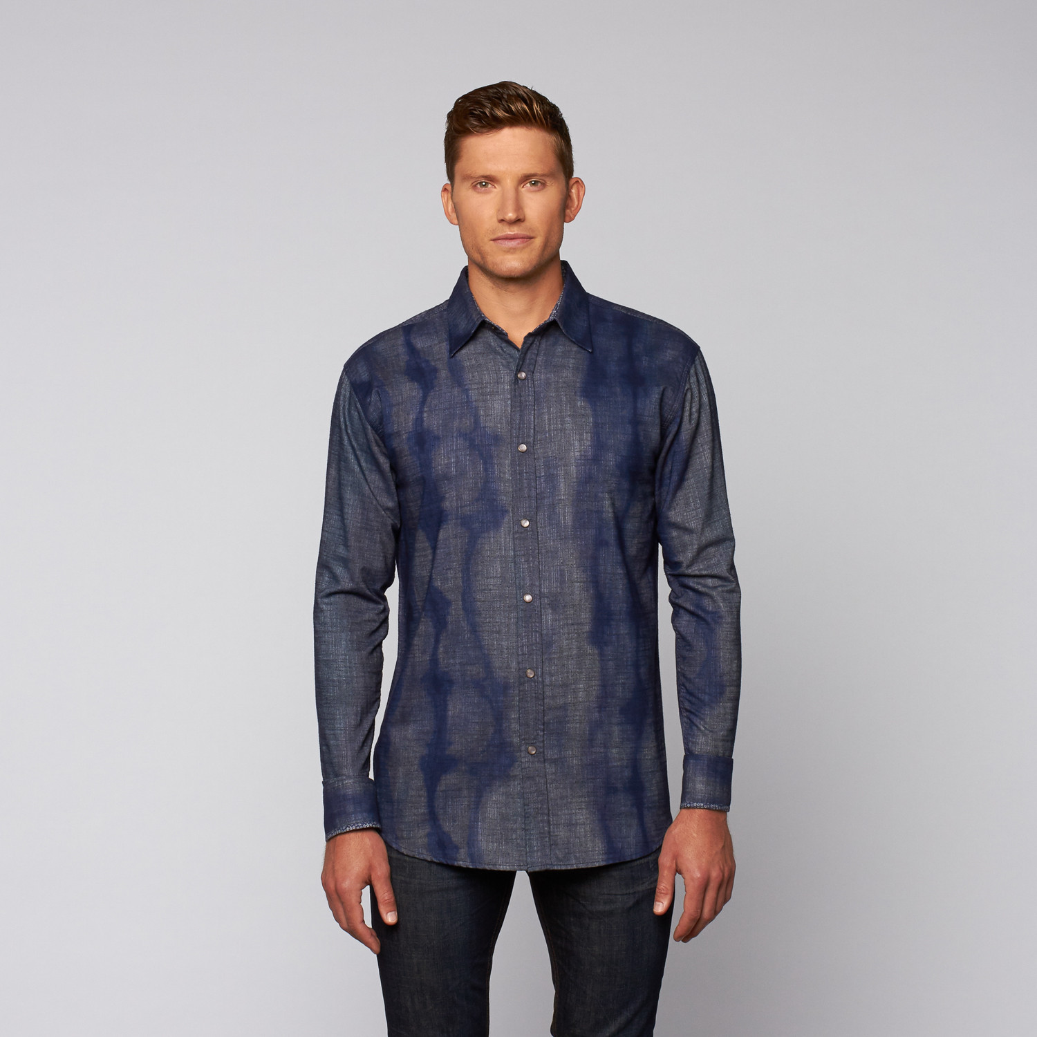 The Cloud Washed Button Up strikes a balance between laid-back, Western style, and traditional, decorative fabrication. Its cloud wash adds a refined touch, while pearlescent snap buttons give it a down-home feel.
