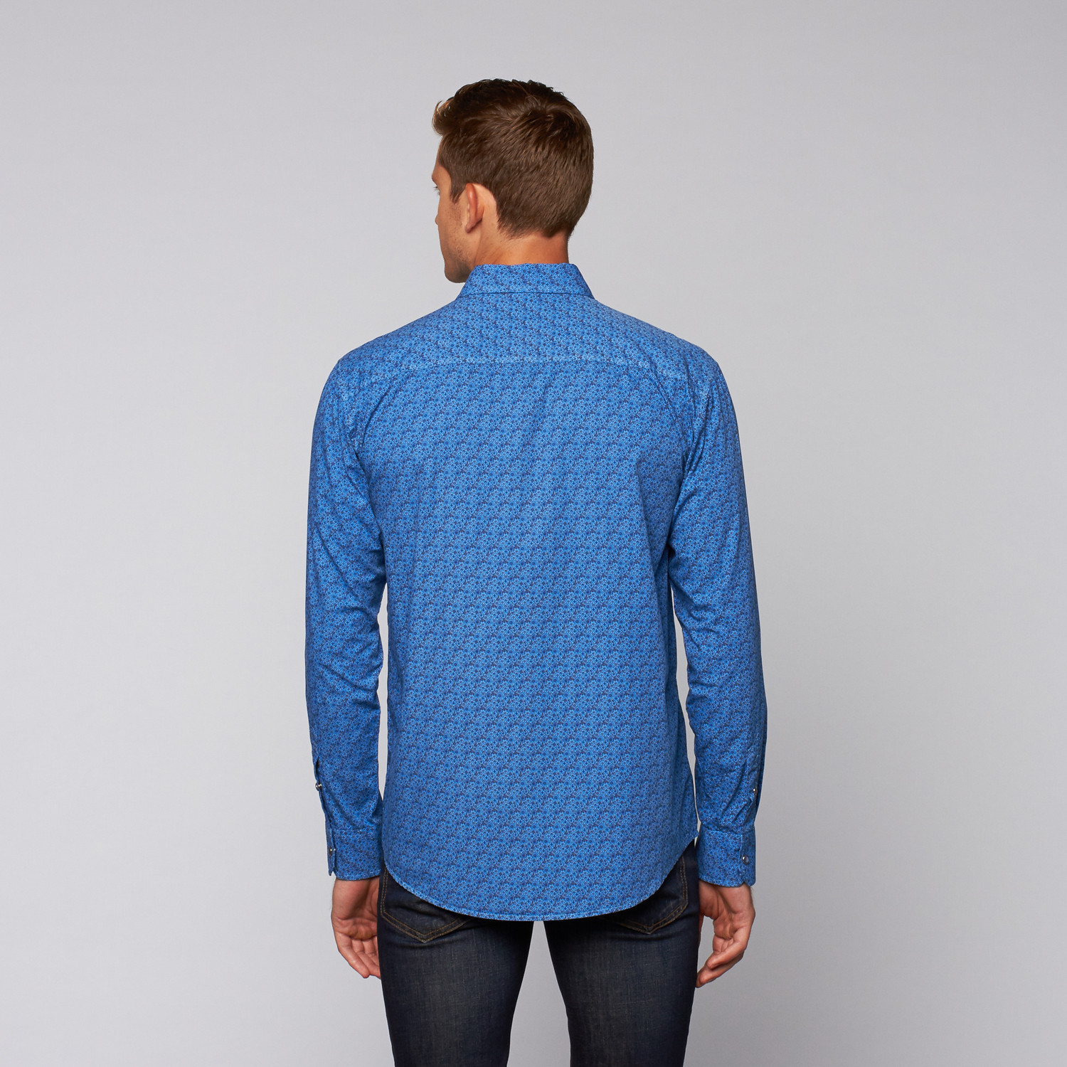 The Printed Button Up strikes a balance between laid-back, Western style, and traditional, decorative fabrication. Its dense microprint adds a refined touch, while pearlescent snap buttons give it a down-home feel.