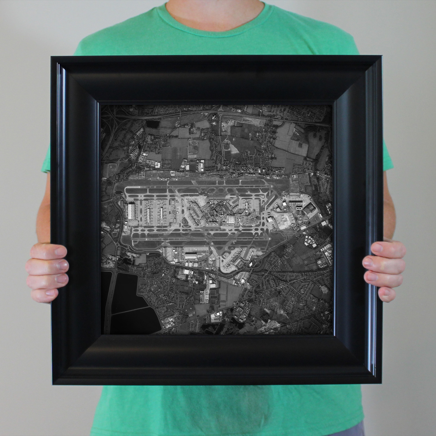 Inspire wanderlust and appreciate incredible architecture with this satellite image of Heathrow Airport. With understated colors and a more unique look than traditional photography, it's the perfect detail for any empty wall space.