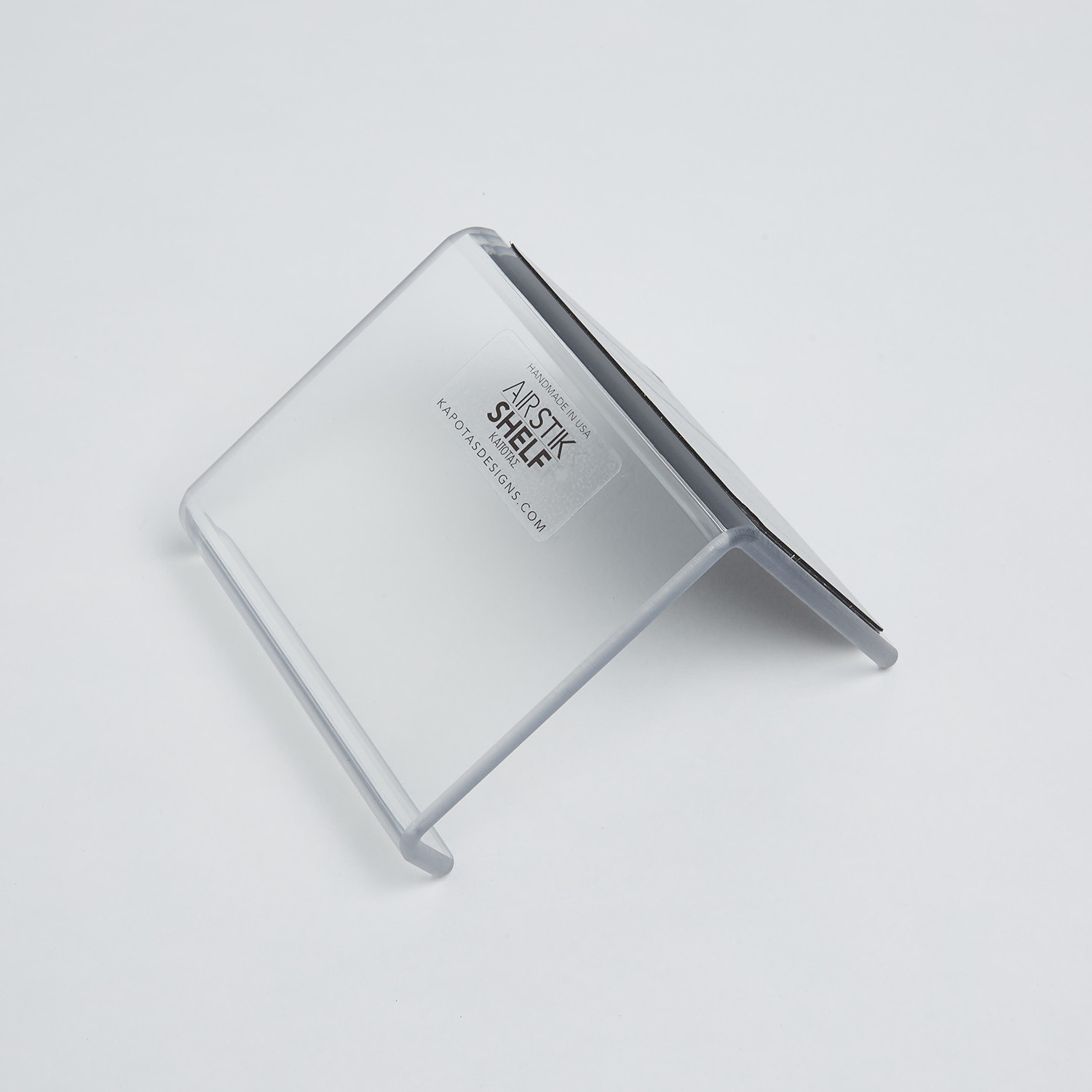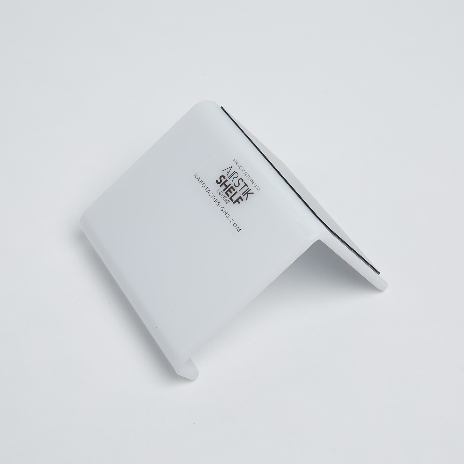 The AIRstik Shelf by Kapotas Designs is a sleek little shelf that can be instantly adhered to virtually any surface - like mirrors, walls, or windows - with the innovative power of AIRstik technology - just press and stick! Best of all, it's infinitely reusable. Pull it off of the surface at any time without causing damage to the surface or leaving any residue behind. Reposition it anywhere, as many times as you like. It never loses suction, and requires no tools or adhesives to install. Each shelf holds up to 5 pounds and if you connect/bridge 2 shelves together, they can collectively hold up to 10 pounds.