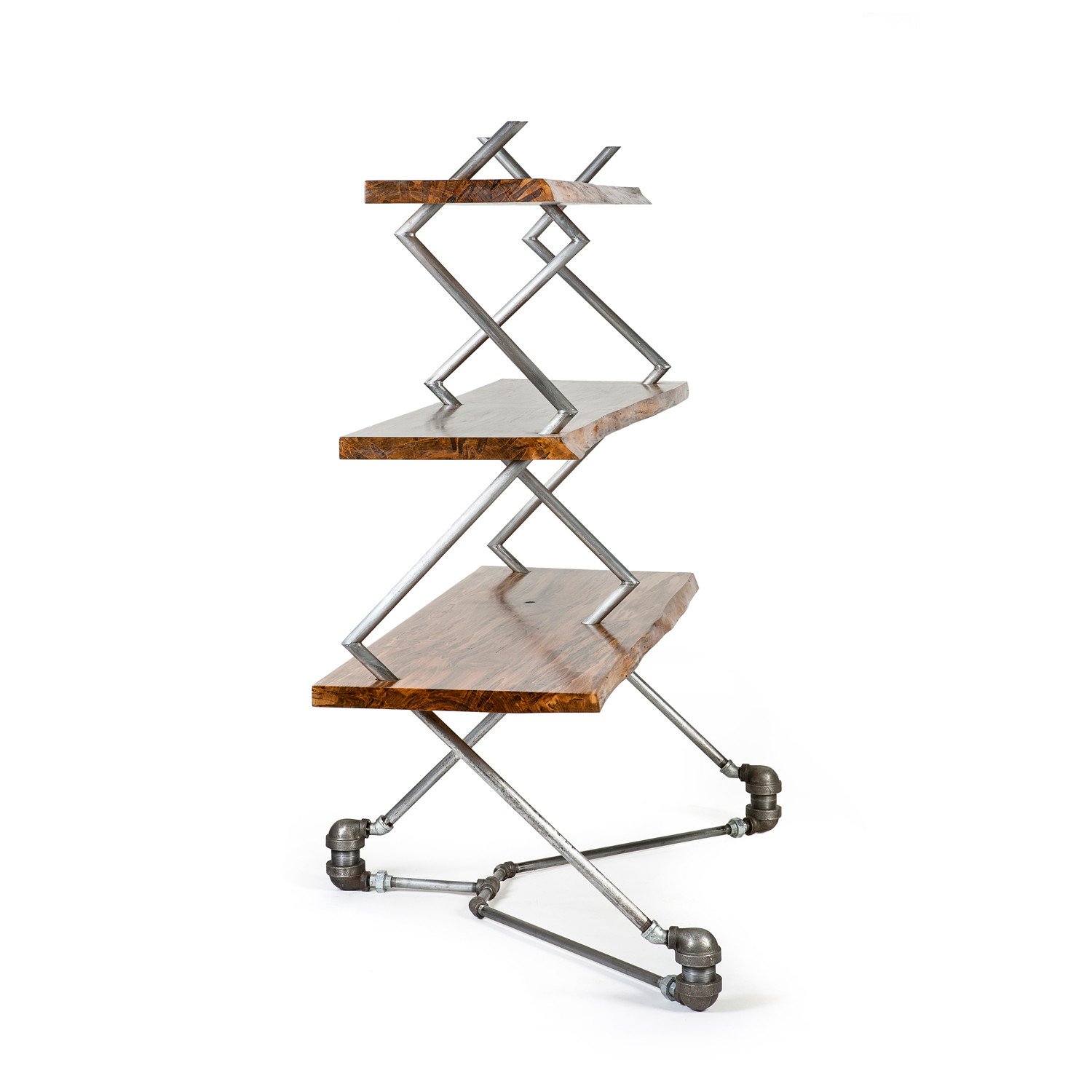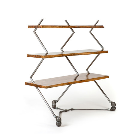 If you love the look of zig-zagging right angles, the Wormy Inertia, Jr. is just for you. While building the piece, the artist had to use scaffolding for support. After removing the scaffolding, he realized that the piece needed more stability and the shelves needed to be secured to the frame. With added the reclaimed plumbing fittings at the base to connect the three legs and stabilize the piece and, also, drillings through the slabs into the pipes to insert screws. Rather than using a wooden plug, he decided to fill the holes with solder. This look was the winner.