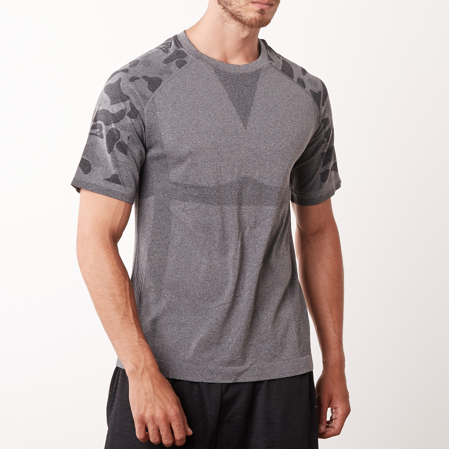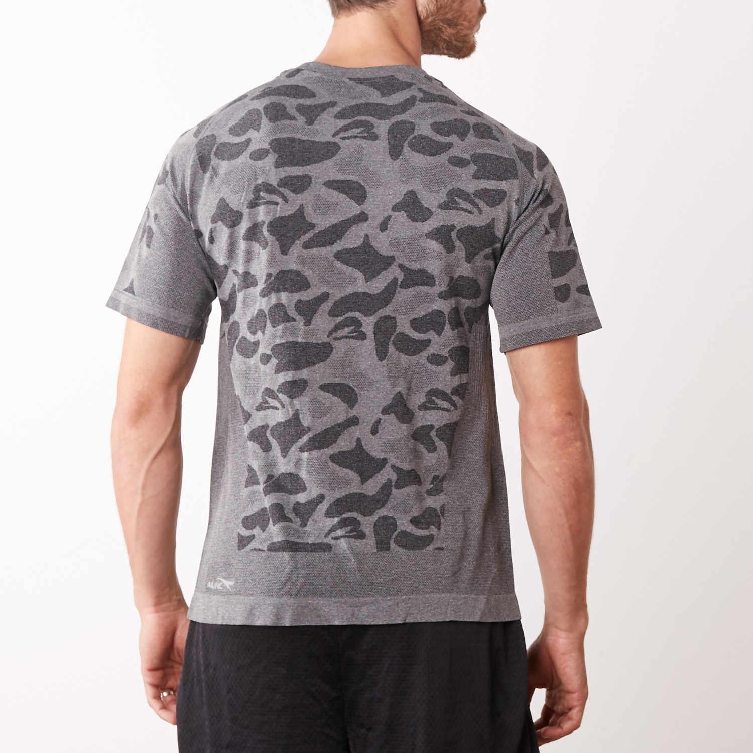 Looser fitted short sleeve crew neck shirt with mesh cut outs on front, side and back creating a cool design aesthetic and optimal cooling. Four-way-stretch fabric wicks sweat and dried quickly. Featured in Medium Grey/ Charcoal with Camo print design