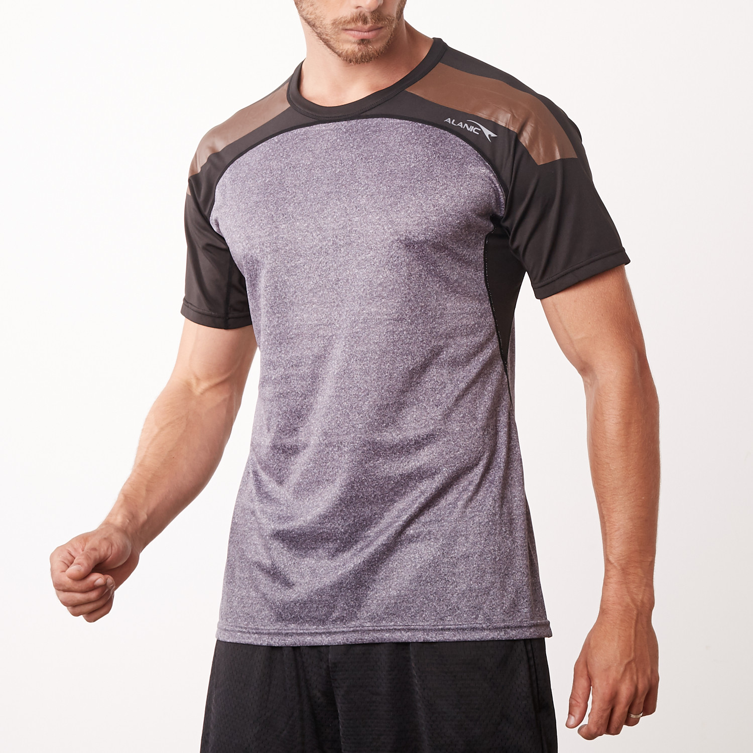 Short sleeve crew neck shirt with leather looking panels. Three different fabrics create a cool design aesthetic. Four-way-stretch fabric wicks sweat and dried quickly. No wonder this is one of our top sellers. Featured Charcoal Grey with Brown/Black/Green Panels.