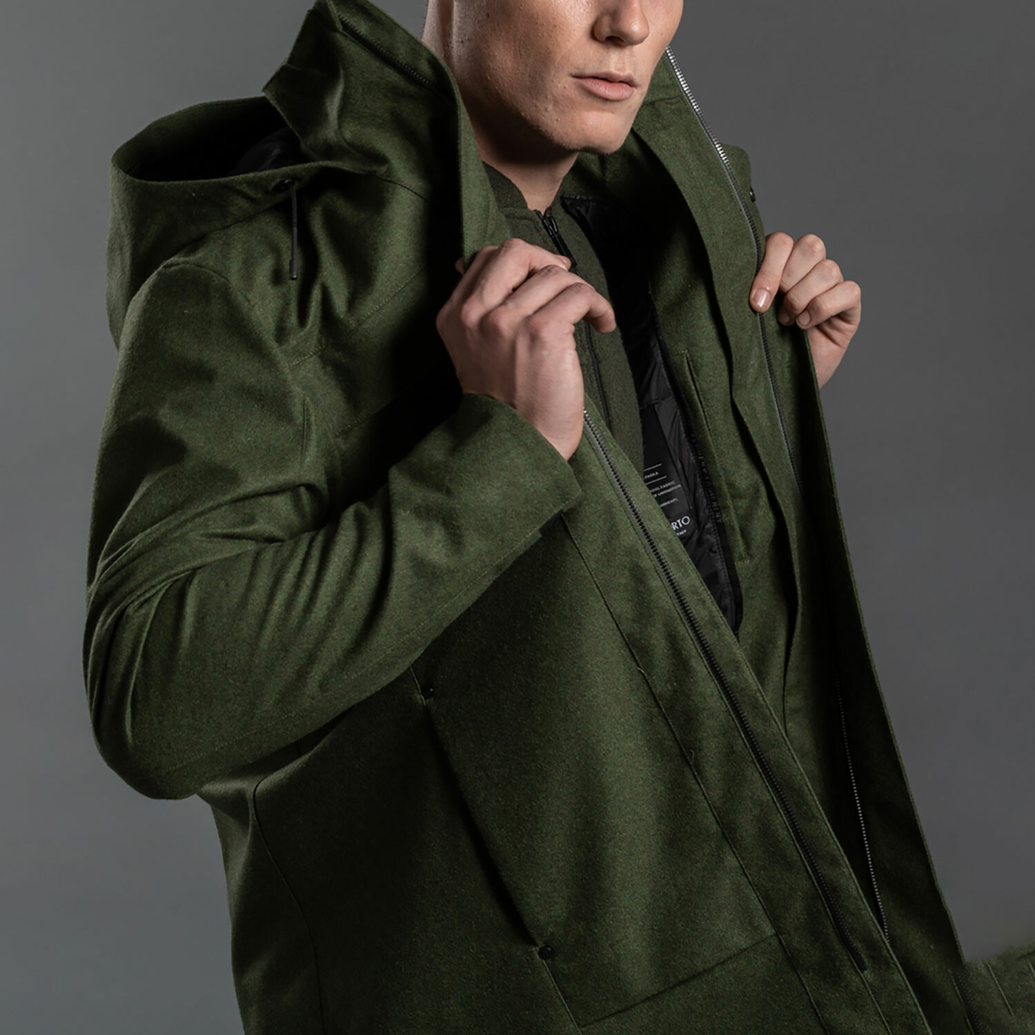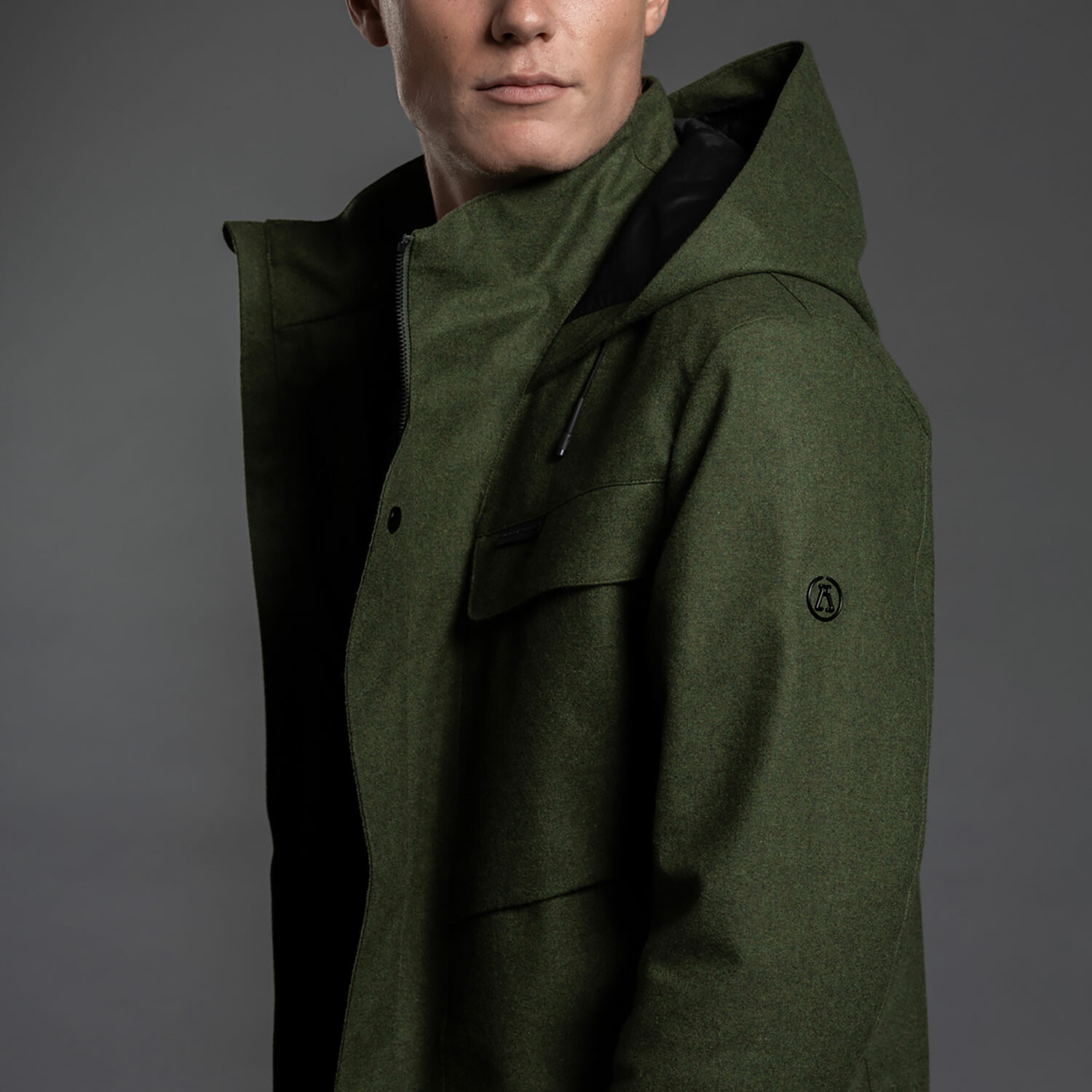 This mid length Laminated Wool Parka is created with a premium Italian wool blend laminated to a high performance water and wind resistant membrane. The aesthetic is rugged and refined, the fit allows for layering up. This piece uses Alchemy's Zi/Zo (Zip in / Zip out) system, making it able to be combined with mid layers in the Alchemy collection.