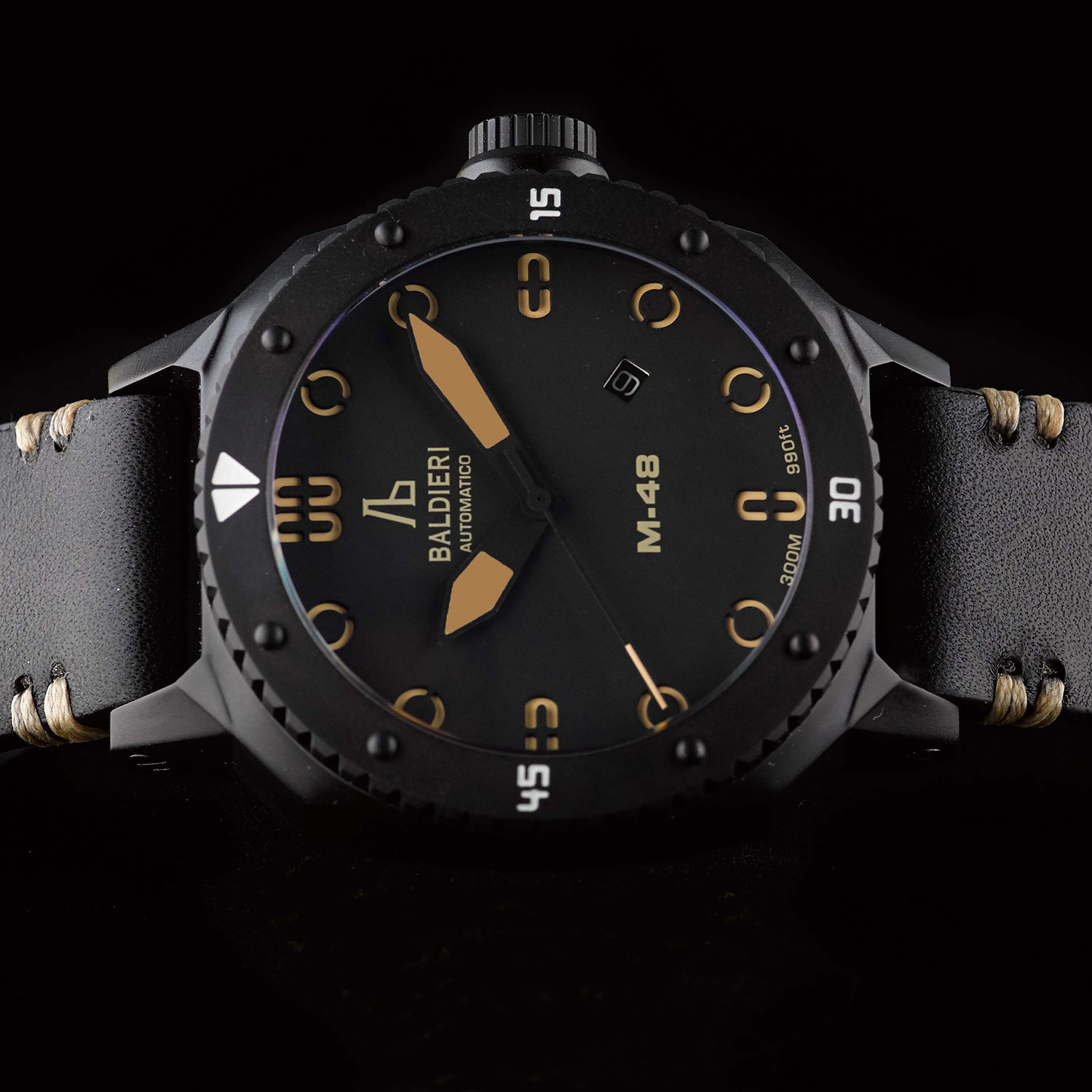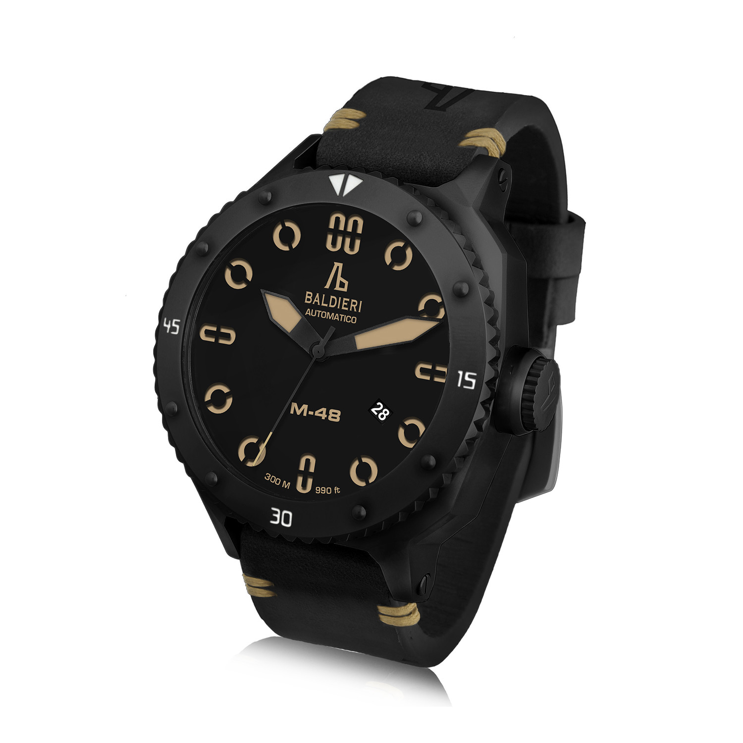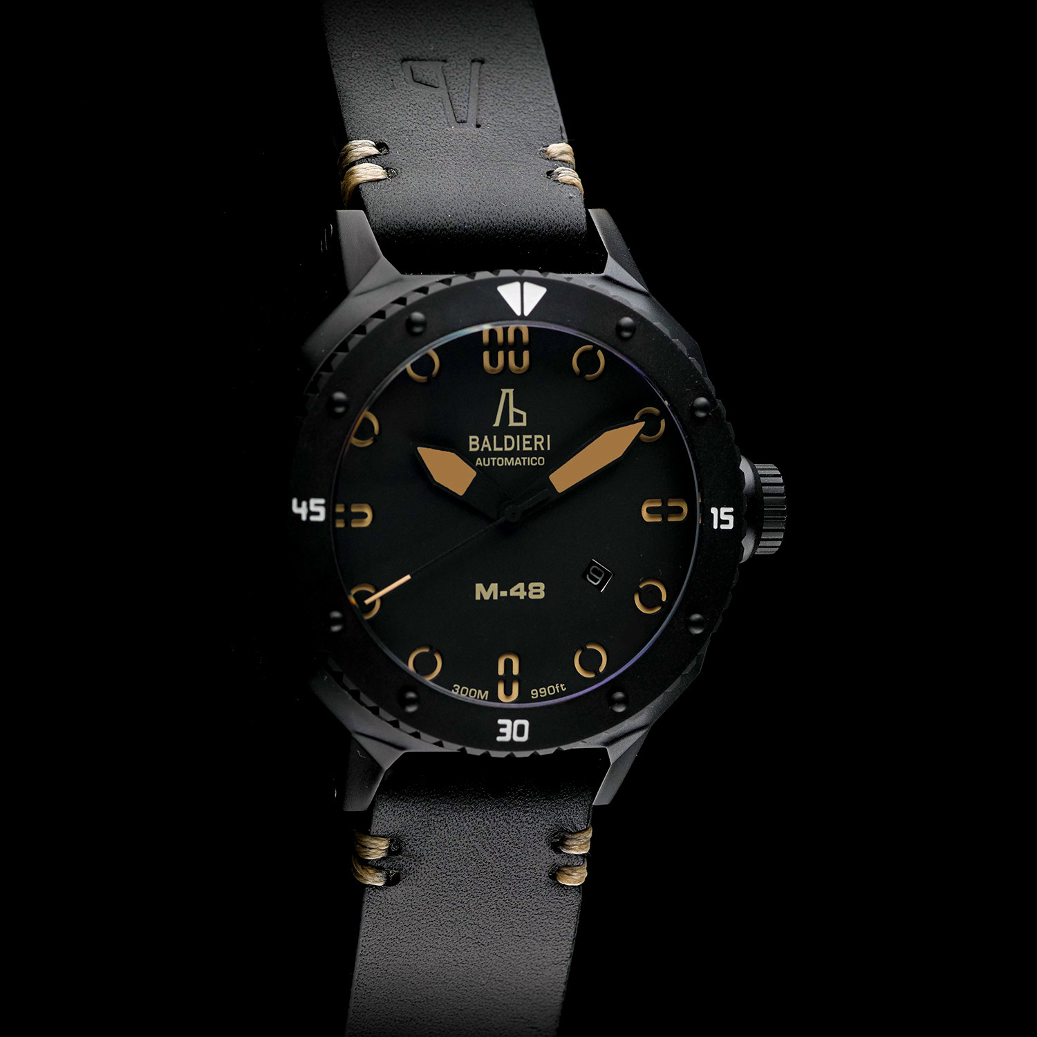 In a limited edition of 150 numbered pieces, the M-48 case is made from a solid 316L stainless steel with print proof finishing. It features an automatic Officine Baldieri movement with 26 jewels, and comes with an Italian ammo leather strap, which has been made by hand and fitted with a stainless buckle.