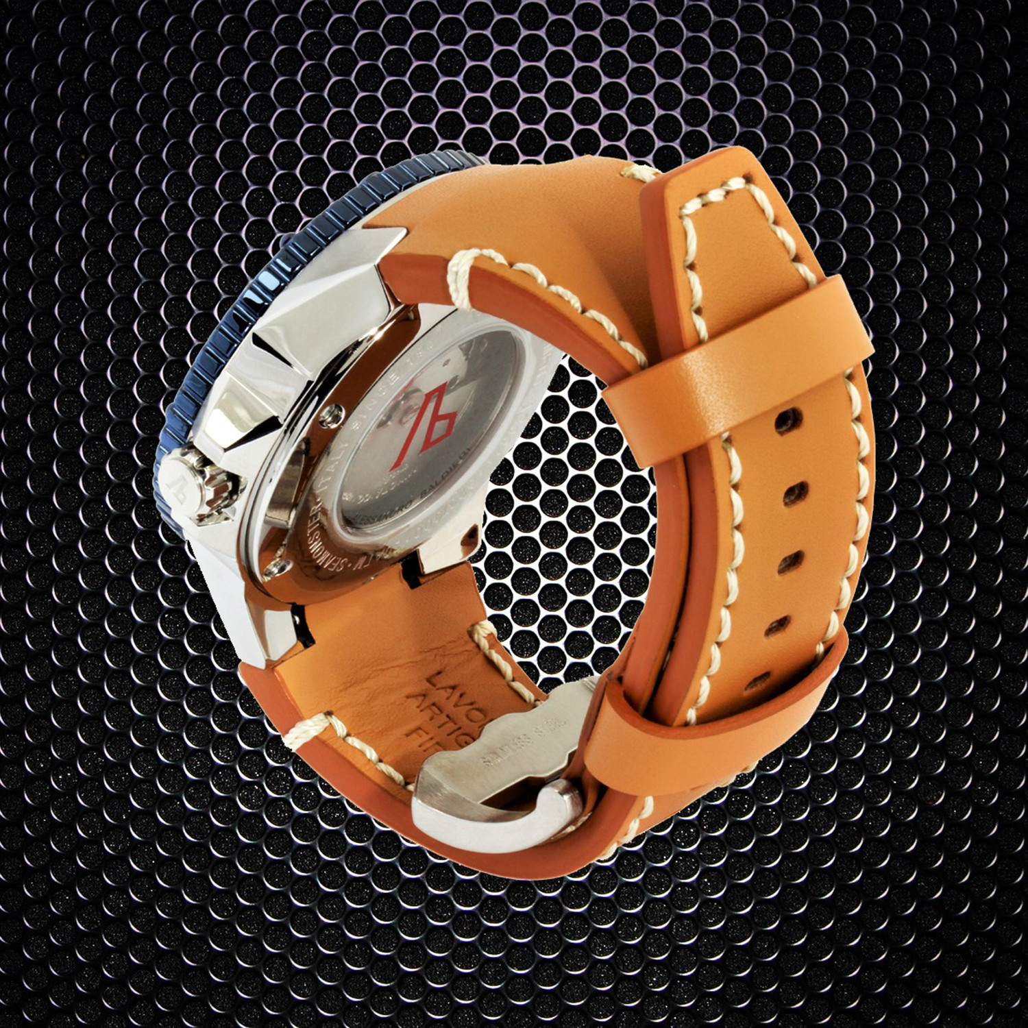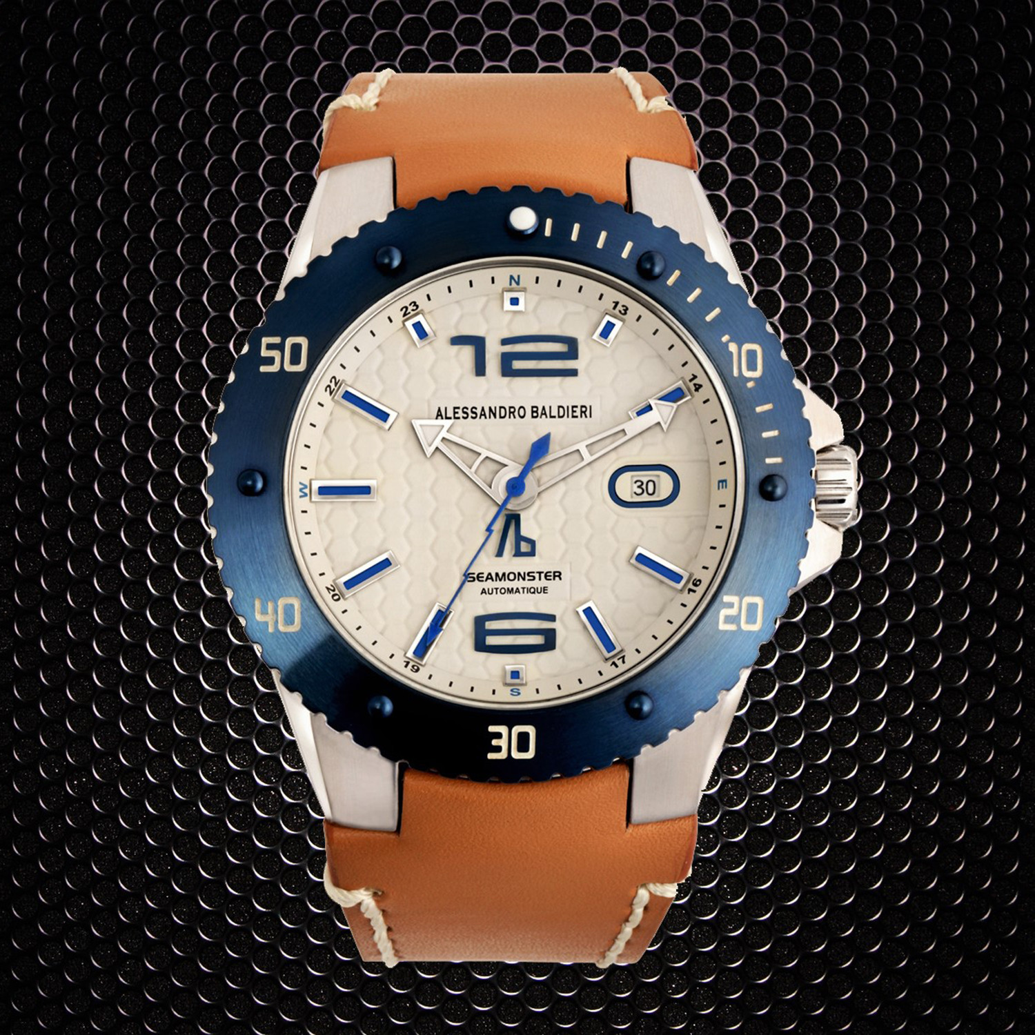 The blue PVD bezel and case of the Seamonster Classico are made from 316L Stainless steel and stainless steel crown. With an automatic movement Miyota 8215 – 21 jewels, 21,600bpm, it includes a matte aged white dial with applied indices and date located at the 3 o’clock position. The hands are see through luminous are in contrast with the dial, and the lens is K1 mineral anti reflective. The Seamonster Classico is equipped with a tan Italian saddle leather strap made by hand and fitted with a stainless buckle.