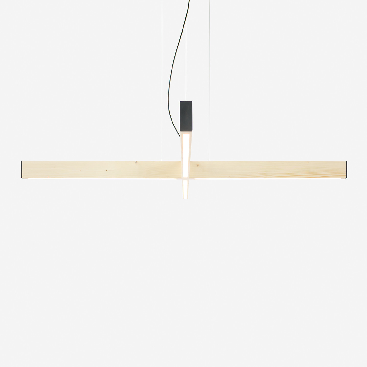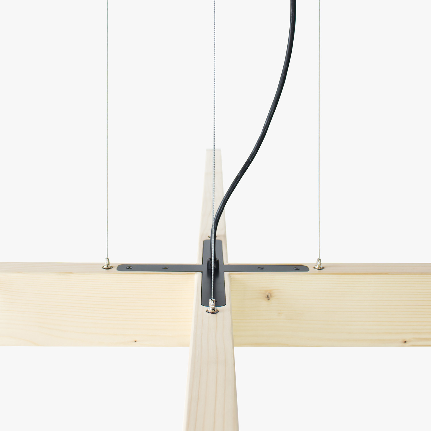 The 2x4 Plus Pendant is made from the most common piece of dimensional lumber, the simple 2x4. The 2x4 Plus Pendant continues to explore the simple 2x4, remaining true to its form, with some luxurious touches. Two 2x4s intersect to form a pendant that is both minimal in form and large in its presence.