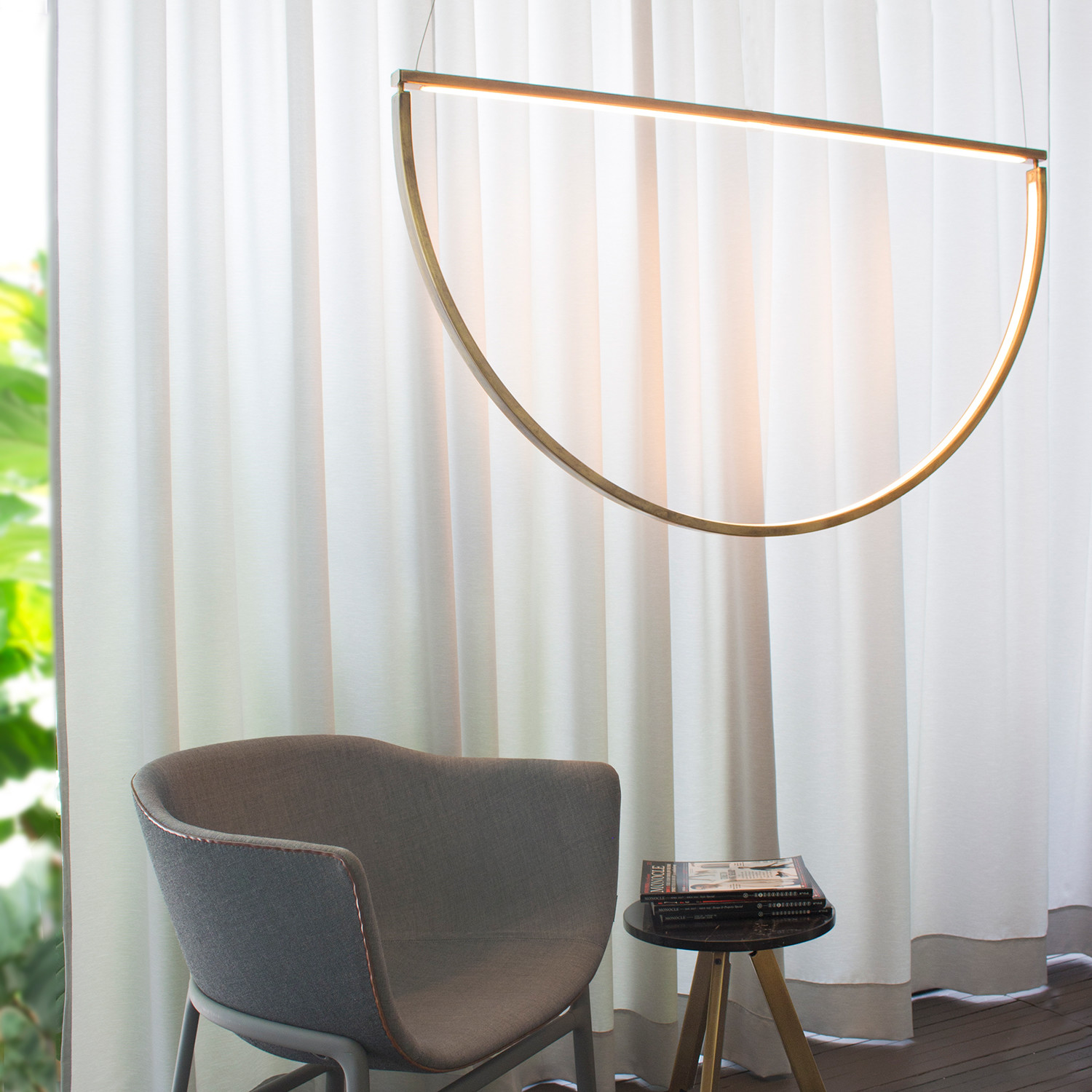 Chord draws inspiration from minimalist jewelry designs, and it's metal finishes and details exude the same refinery and elegance. Light emanates into a void, its source hidden in the simple form of a delineated semi circle. The impressive atmospheric effect of this light is emphasized through this unique geometric shape.