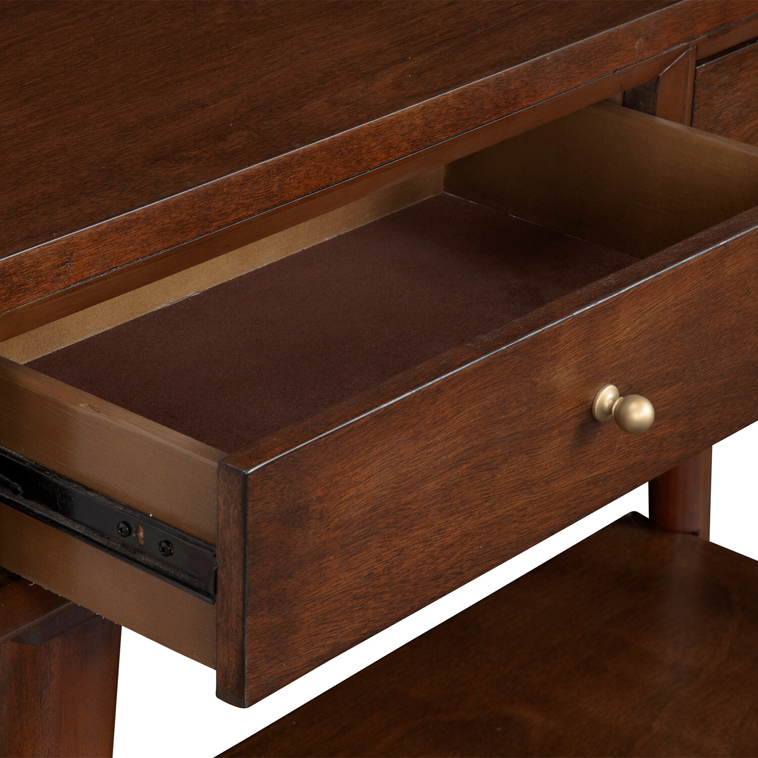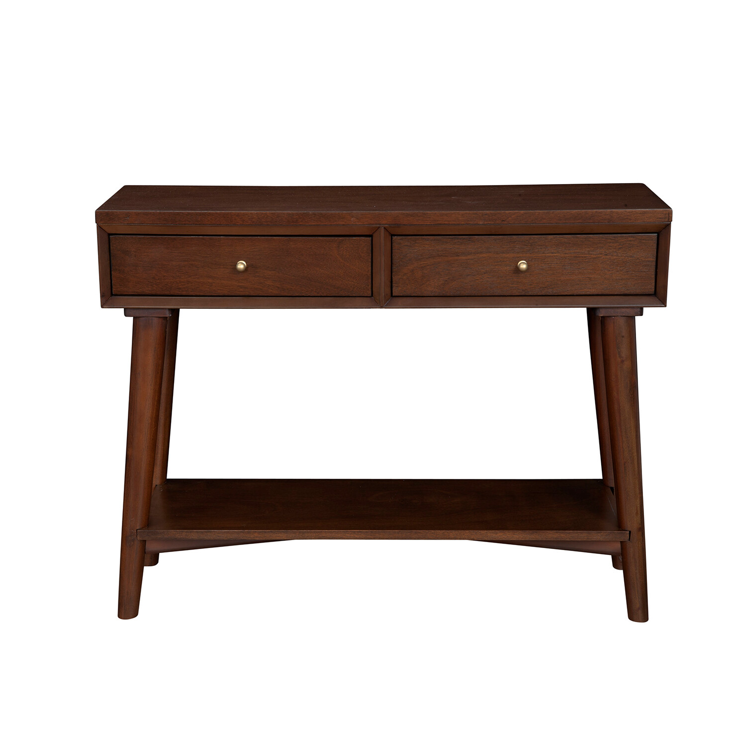 Streamlined and modern, the Flynn Console Table updates the aesthetic of your home. Mahogany wood solids and Okume veneer are finished in a rich walnut finish and blend effortlessly with your color scheme. This piece features flared legs, accent hardware, and 2 felt-lined drawers. Mix and match with other pieces from the Alpine Furniture Flynn collection.