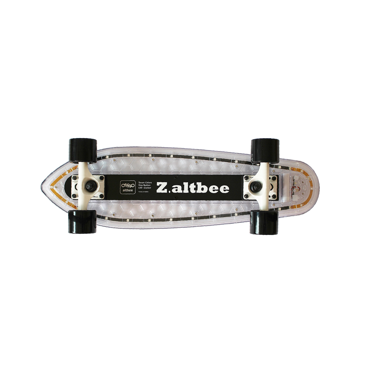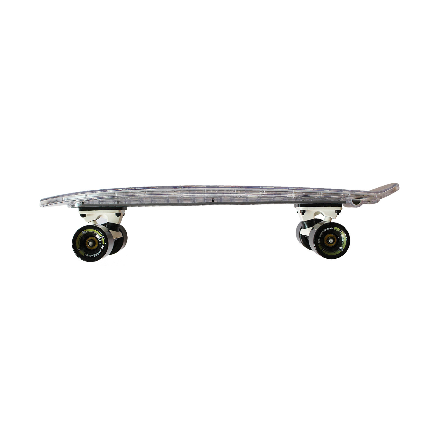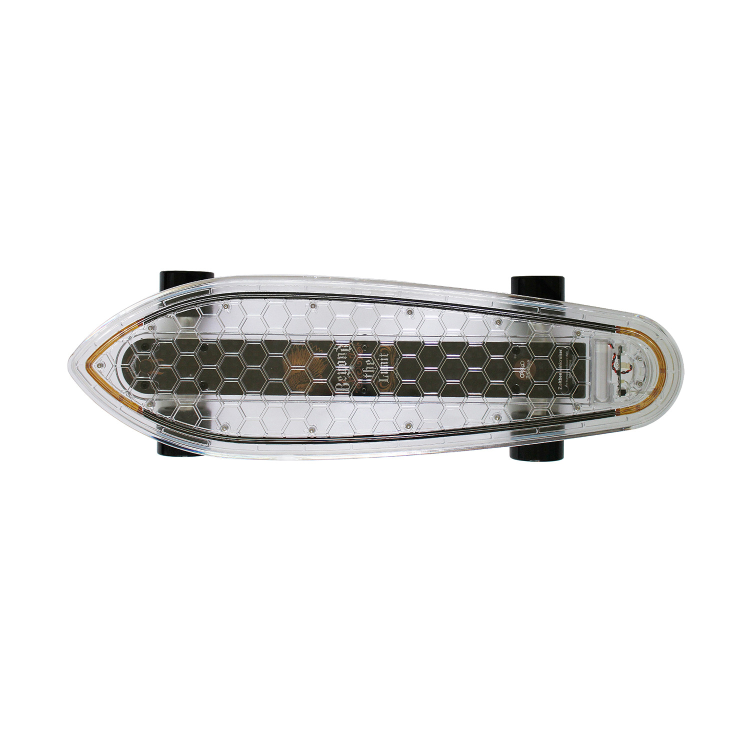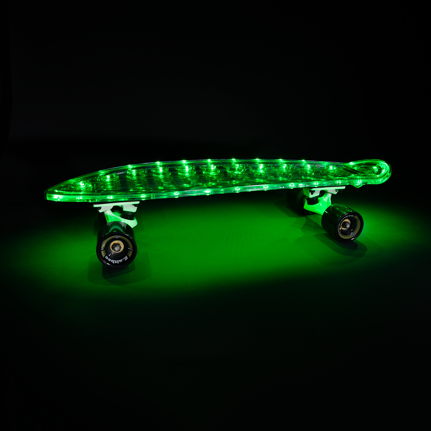 The Desire Minicruiser is a unique minicruiser that has a clear deck with 26 LEDs that make the rider stand out while cruising. The Desire Minicruiser is constructed with very durable polycarbonate deck and stiff duralumin trucks giving the rider a strong board that will not bend or break under the weight of the rider. The ABEC 7 bearings and the 62mm 78A wheels give the rider a fast and smooth ride. By placing 26 vibrant LEDs, the board can light up in seven different colors or flash through all seven! It includes a rechargeable Lithium Ion battery that lasts up to 15 hours and can be charged using the included USB charger. The polycarbonate deck allows the LEDs to shine through making the rider stand out during the day and night!