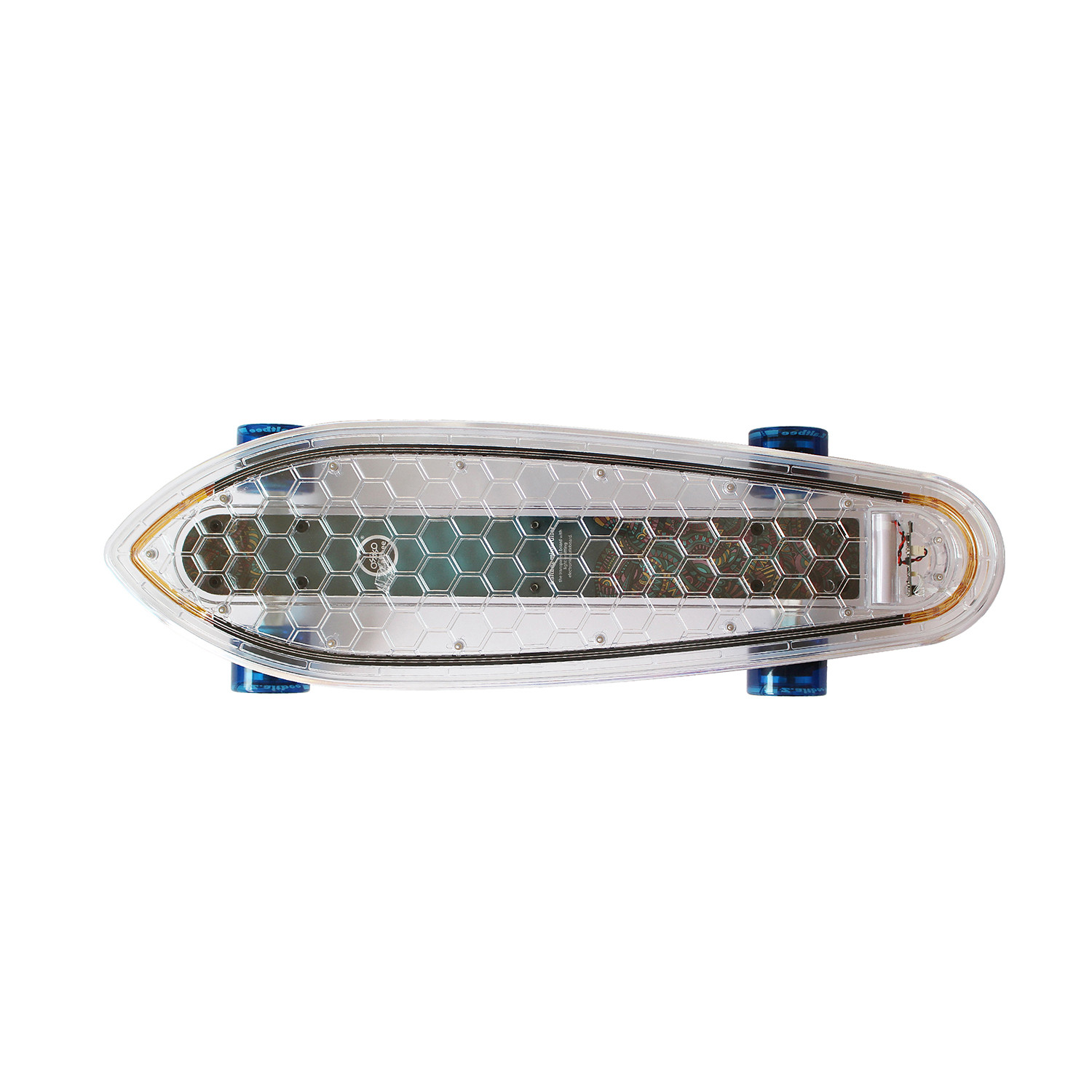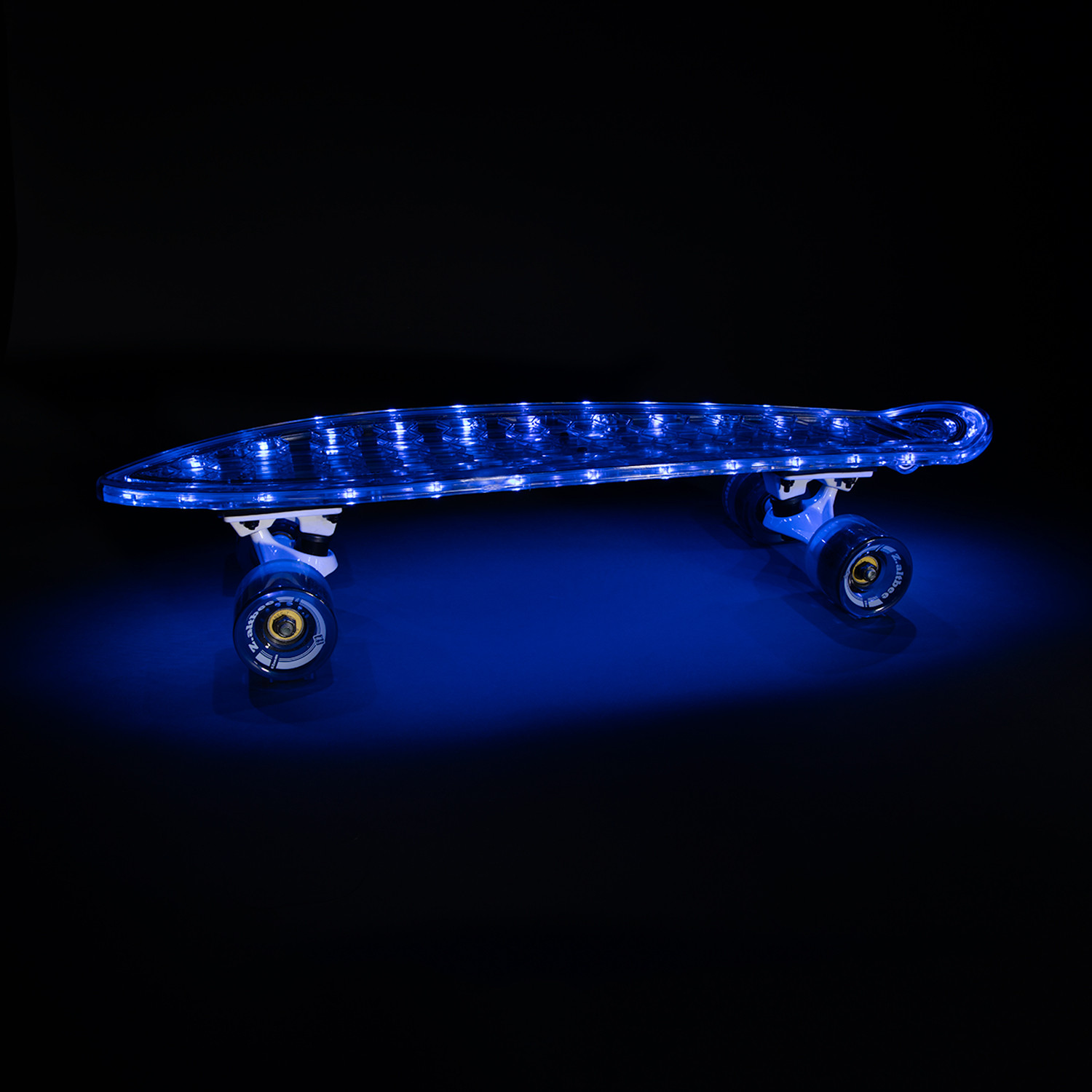 The Desire Minicruiser is a unique minicruiser that has a clear deck with 26 LEDs that make the rider stand out while cruising. The Desire Minicruiser is constructed with very durable polycarbonate deck and stiff duralumin trucks giving the rider a strong board that will not bend or break under the weight of the rider. The ABEC 7 bearings and the 62mm 78A wheels give the rider a fast and smooth ride. By placing 26 vibrant LEDs, the board can light up in seven different colors or flash through all seven! It includes a rechargeable Lithium Ion battery that lasts up to 15 hours and can be charged using the included USB charger. The polycarbonate deck allows the LEDs to shine through making the rider stand out during the day and night!