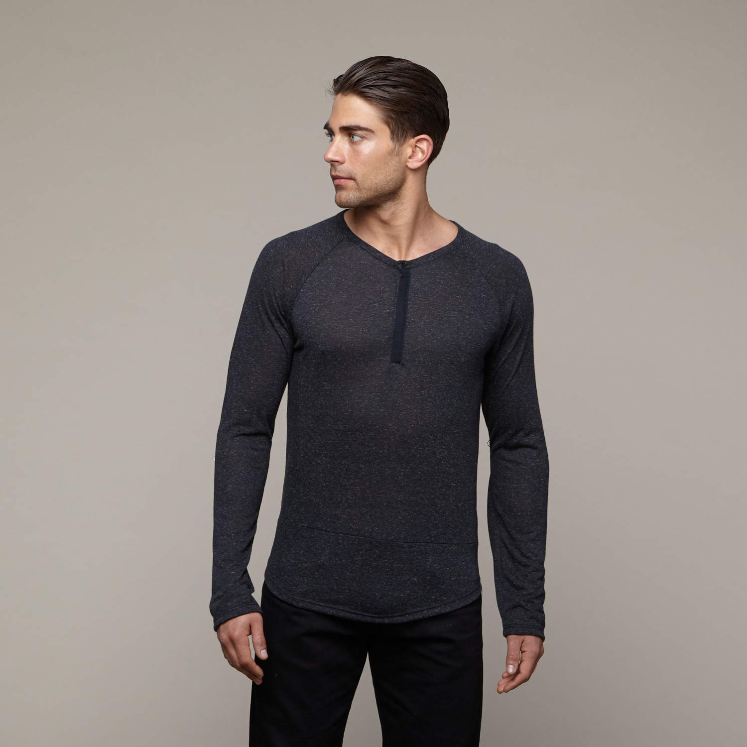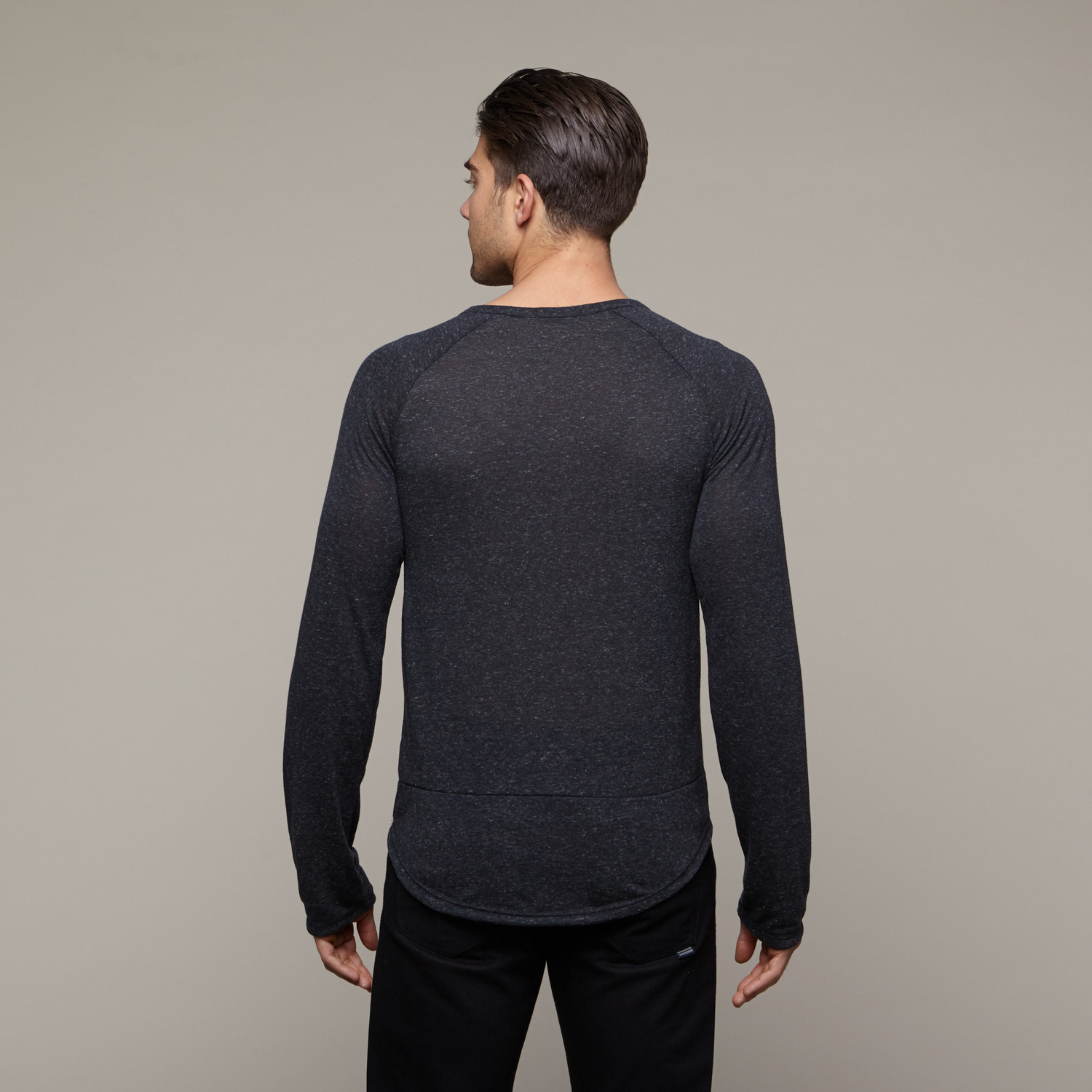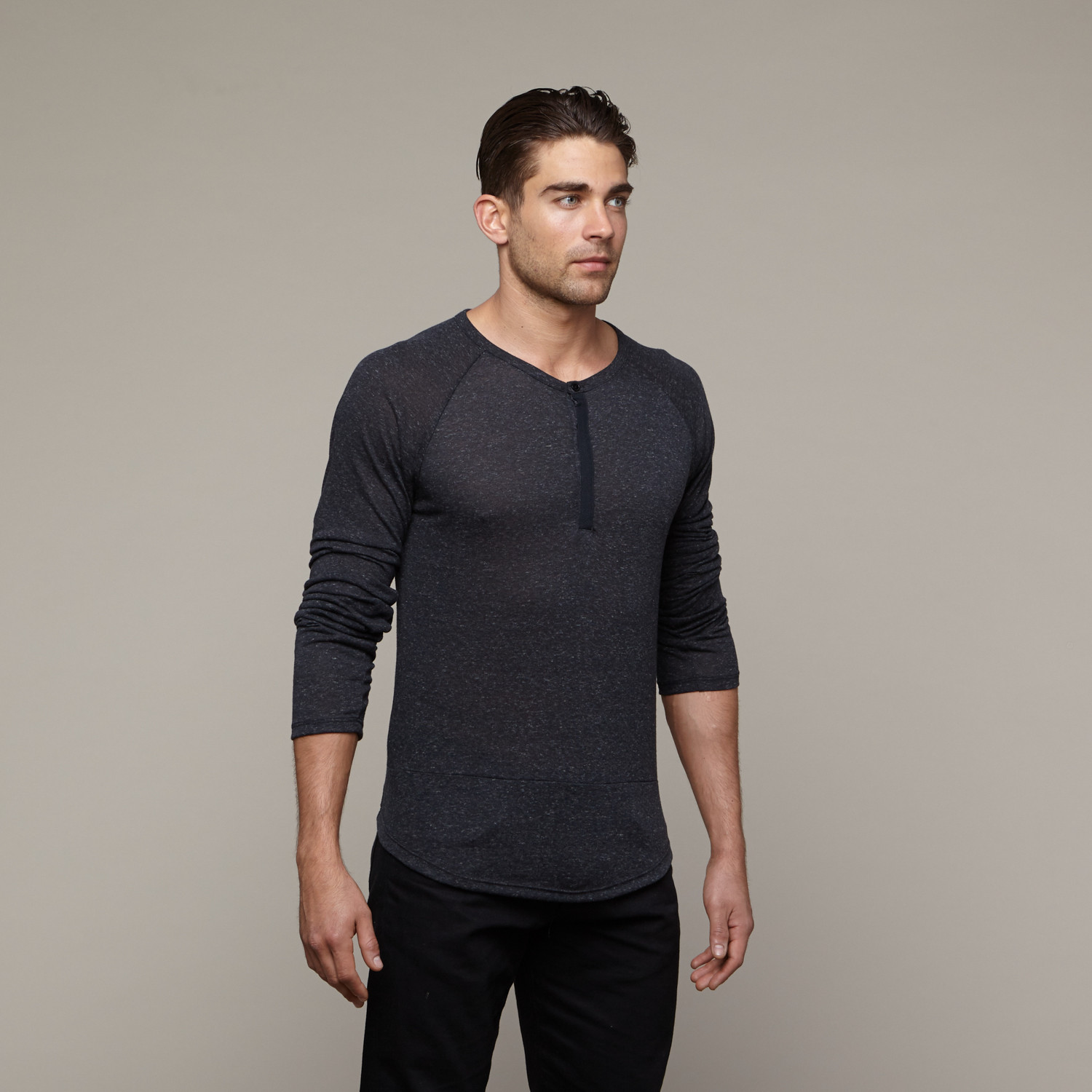 A handsome henley, this Eco-Splash long-sleeve features a rich solid style with scooped bottom hem.