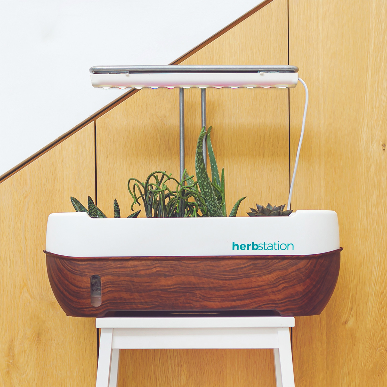This compact garden features magnetic LED grow lights that are easily height adjustable to accommodate your growing plants. The addition of patented self-watering technology allows you to be a great plant parent without the added stress. Herbstation stores 7-10 days worth of water and provides on-demand watering using capillary action and gravity. All you need to do is top up the water level every week or so.