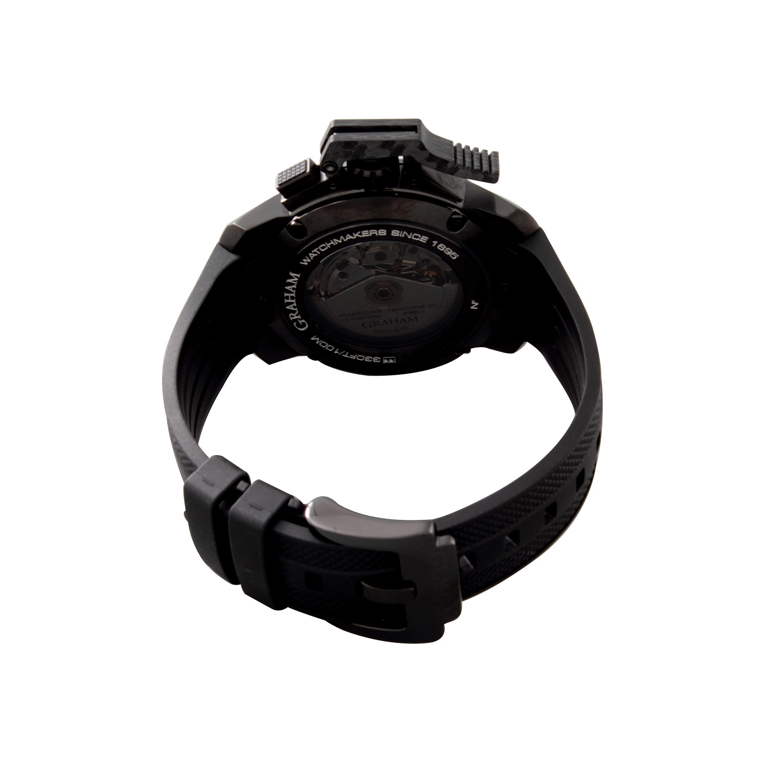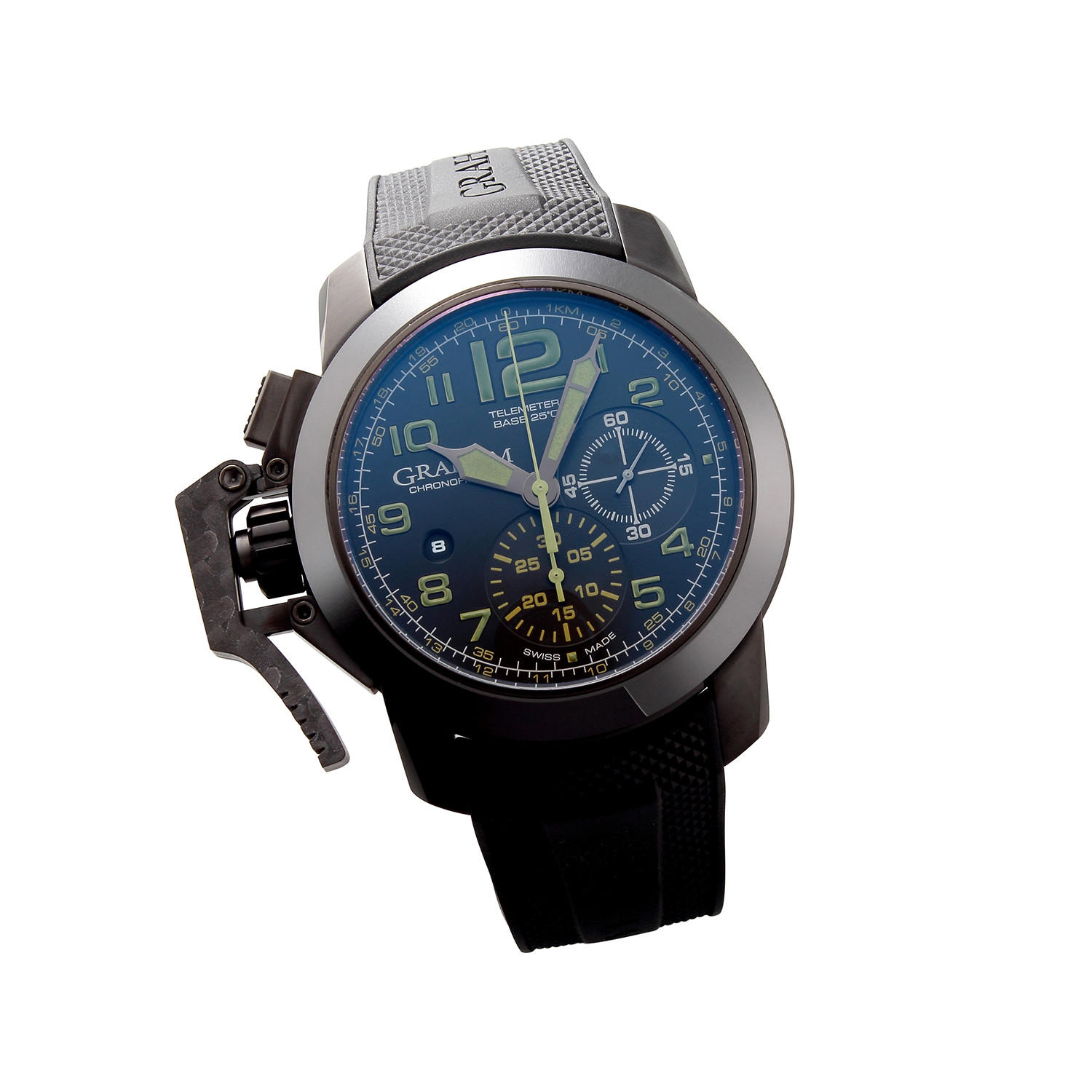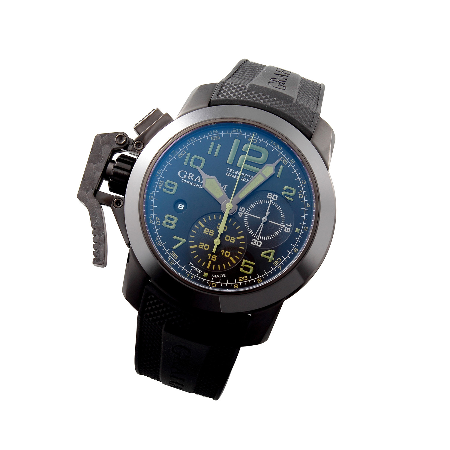 This Graham Oversize Chronofighter oversize automatic men’s watch is truly an extraordinary timepiece. With its prominent and oversized left-side thumb-controlled lever mechanism, the world took notice when the Chronofighter was released in 2000. It is powered by a complex automatic movement, and features the latest daring design influences.