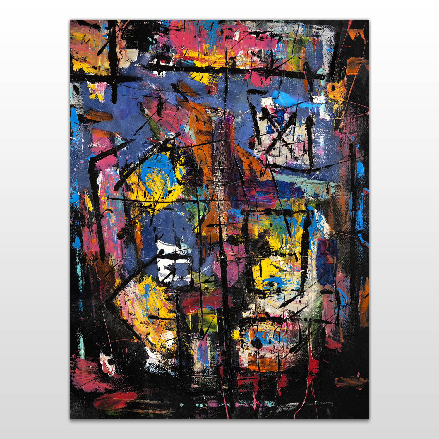 Growing up near the house where Salvador Dali lived in Spain, Xavier was fascinated in incorporating the outstanding character, Dali was able to, in his personal work. Here, the amusing colors are separated by violent streaks of black, truly letting the color pop out of the canvas.