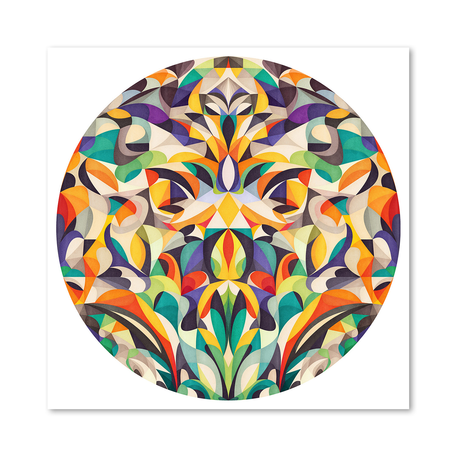 A complex, colorful, and dynamic geometrical whirl encased in a spherical border, Forget Me plays with control and release, and will make a fine focal point for any space. This giclée art print is a perfect addition to your bourgeoning art collection.