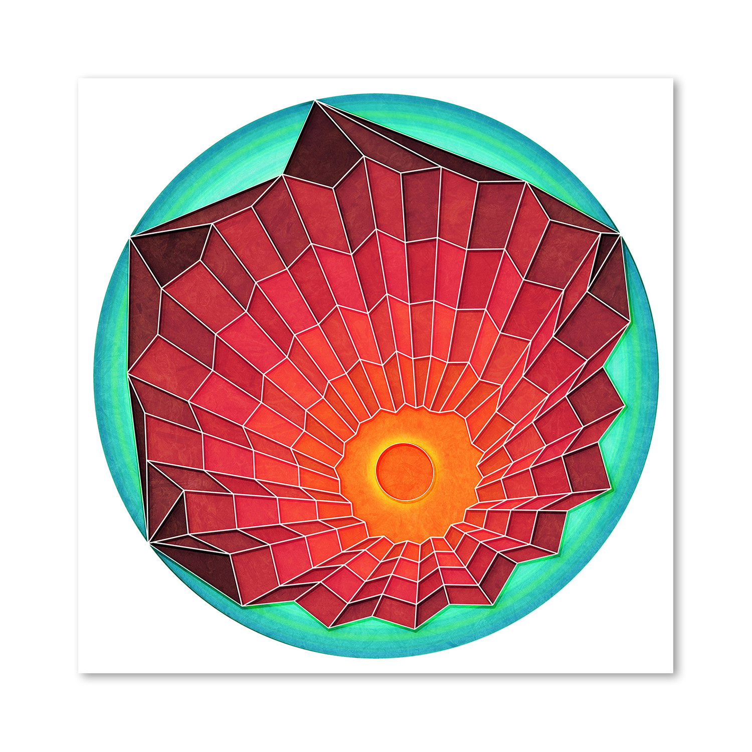A complex, colorful, and dynamic geometrical whirl encased in a spherical border, Hidden But Sometimes Seen plays with control and release, and will make a fine focal point for any space. This giclée art print is a perfect addition to your bourgeoning art collection.