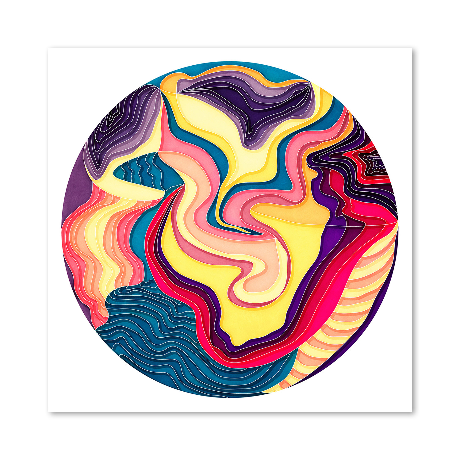 A complex, colorful, and dynamic geometrical whirl encased in a spherical border, I Dream In Colors plays with control and release, and will make a fine focal point for any space. This giclée art print is a perfect addition to your bourgeoning art collection.