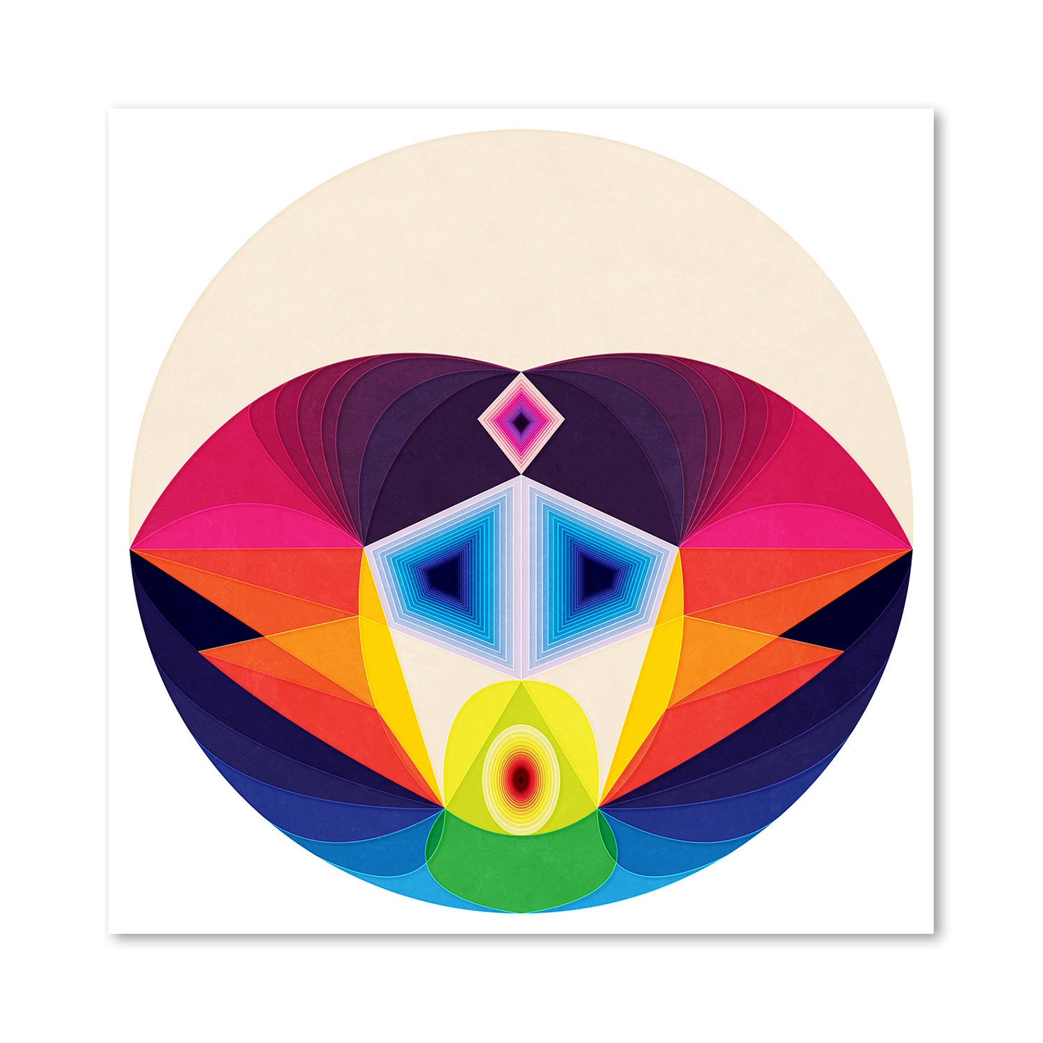 A complex, colorful, and dynamic geometrical whirl encased in a spherical border, It's Just a Dream plays with control and release, and will make a fine focal point for any space. This giclée art print is a perfect addition to your bourgeoning art collection.