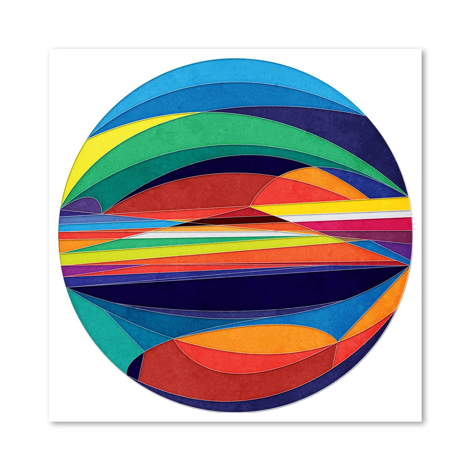 A complex, colorful, and dynamic geometrical whirl encased in a spherical border, Some plays with control and release, and will make a fine focal point for any space. This giclée art print is a perfect addition to your bourgeoning art collection.