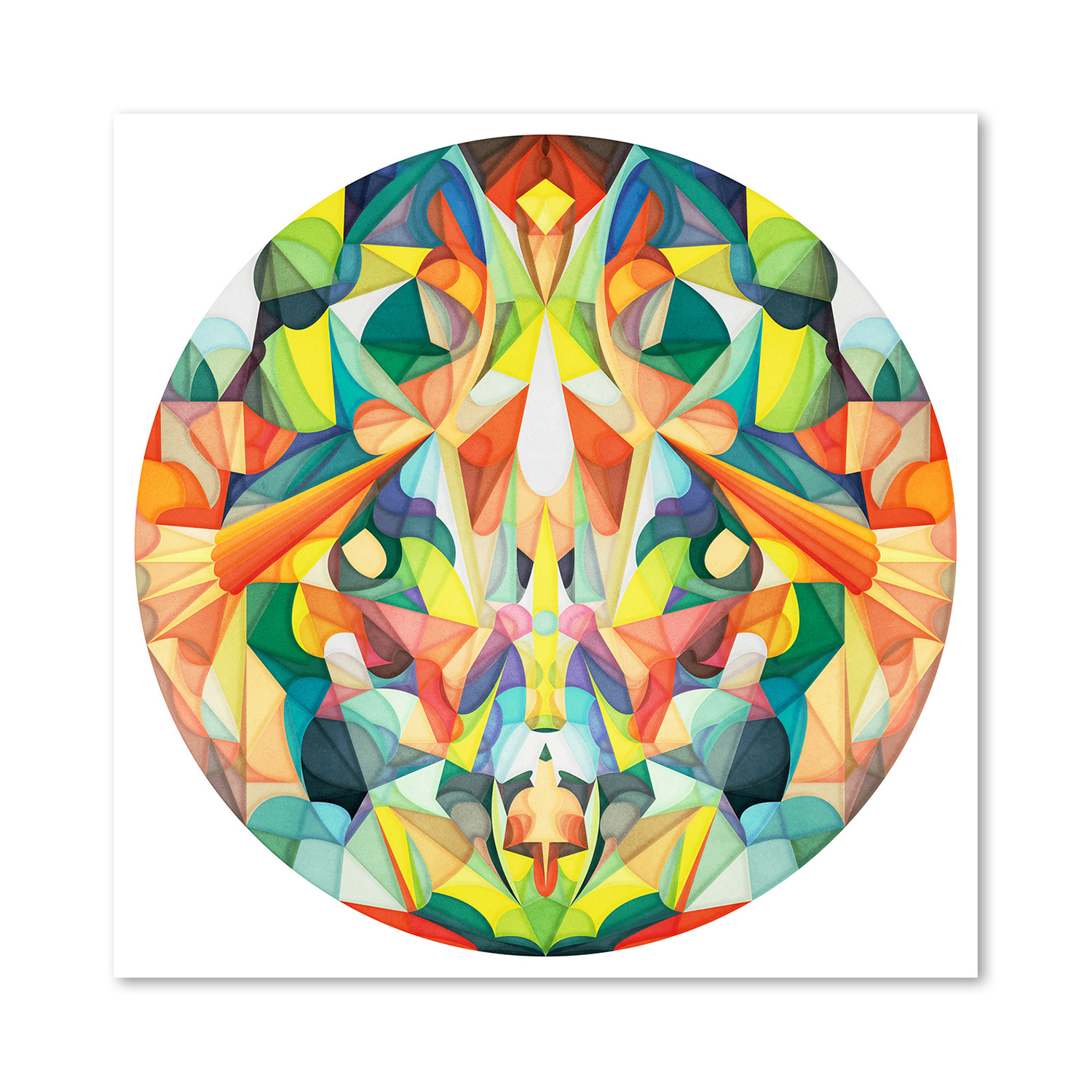 A complex, colorful, and dynamic geometrical whirl encased in a spherical border, Spring Thing plays with control and release, and will make a fine focal point for any space. This giclée art print is a perfect addition to your bourgeoning art collection.