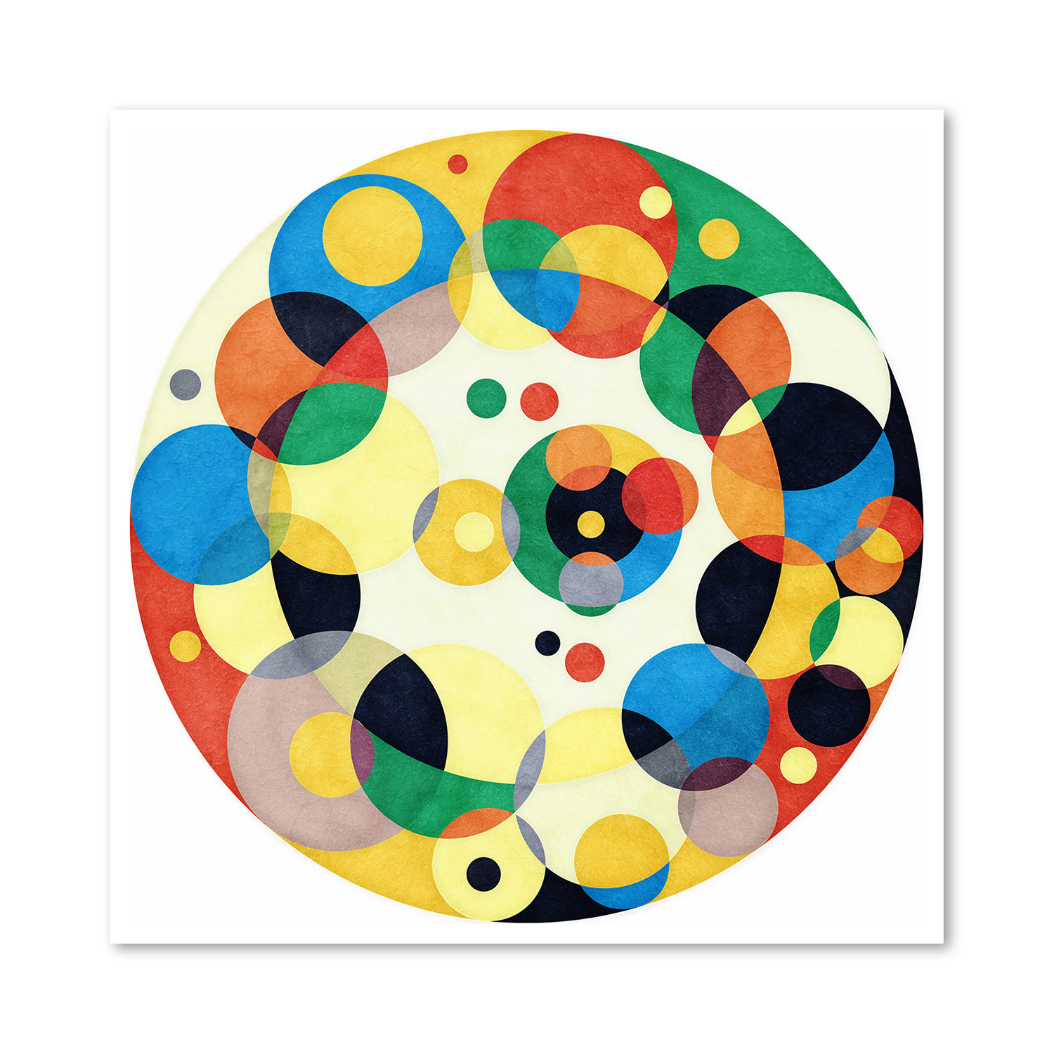 A complex, colorful, and dynamic geometrical whirl encased in a spherical border, Well Hidden plays with control and release, and will make a fine focal point for any space. This giclée art print is a perfect addition to your bourgeoning art collection.