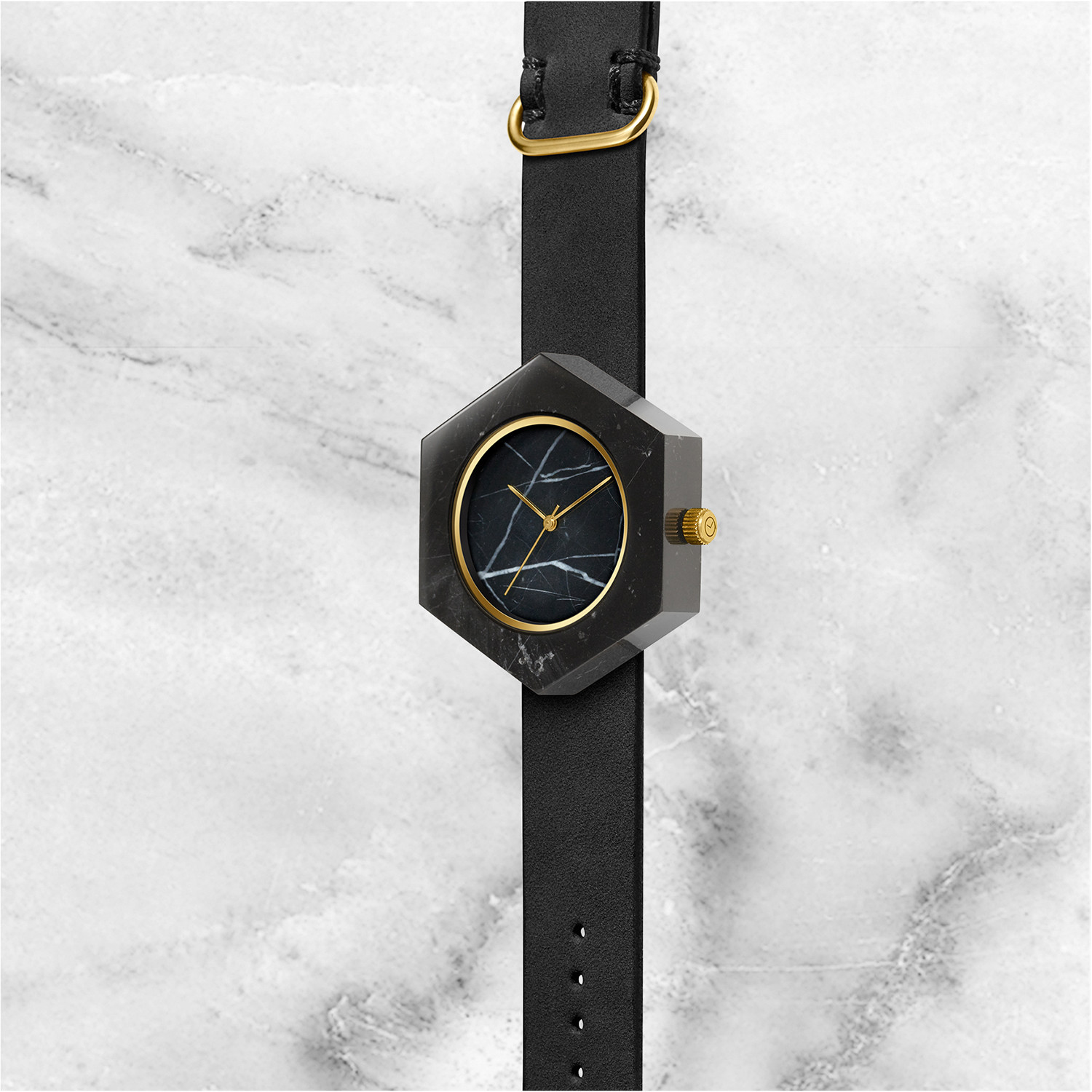 The Black Marble Hex Watch was designed to be distinctive and minimal in form. This gender-neutral piece is meant to call to mind those experiences when we are close to nature, and to serve as a symbol of our connection to the environment in which we live.