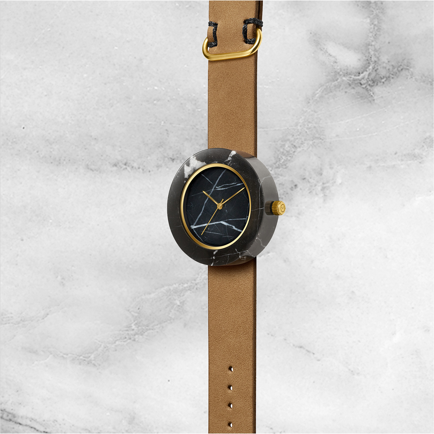 The Black Marble Round Watch was designed to be distinctive and minimal in form. This gender-neutral piece is meant to call to mind those experiences when we are close to nature, and to serve as a symbol of our connection to the environment in which we live.