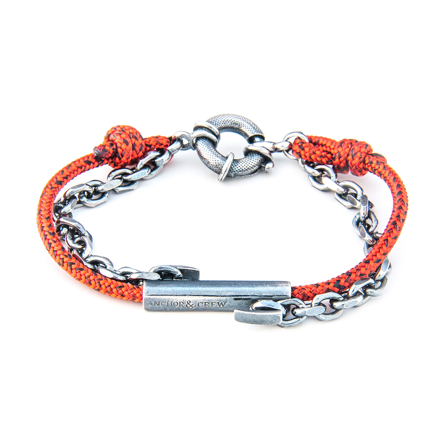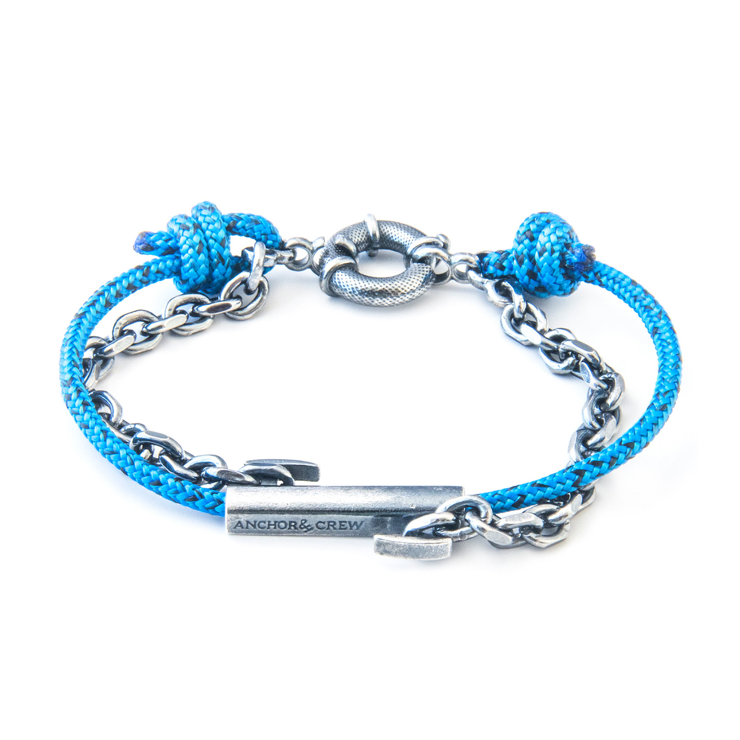 The Belfast Bracelet was both designed and skillfully handcrafted completely in Great Britain. Inspired by mechanical and nautical objects, the Belfast Bracelet features performance grade polyester and nylon rope as well as a secure silver lifeboat clasp, cleat, and naval chain.