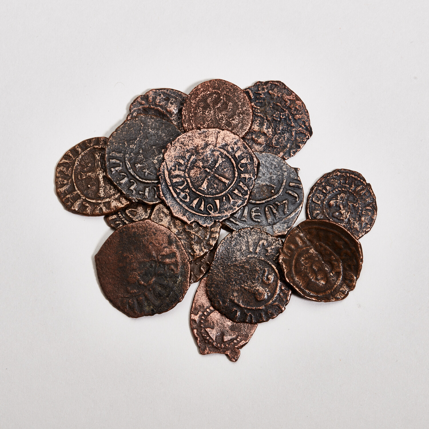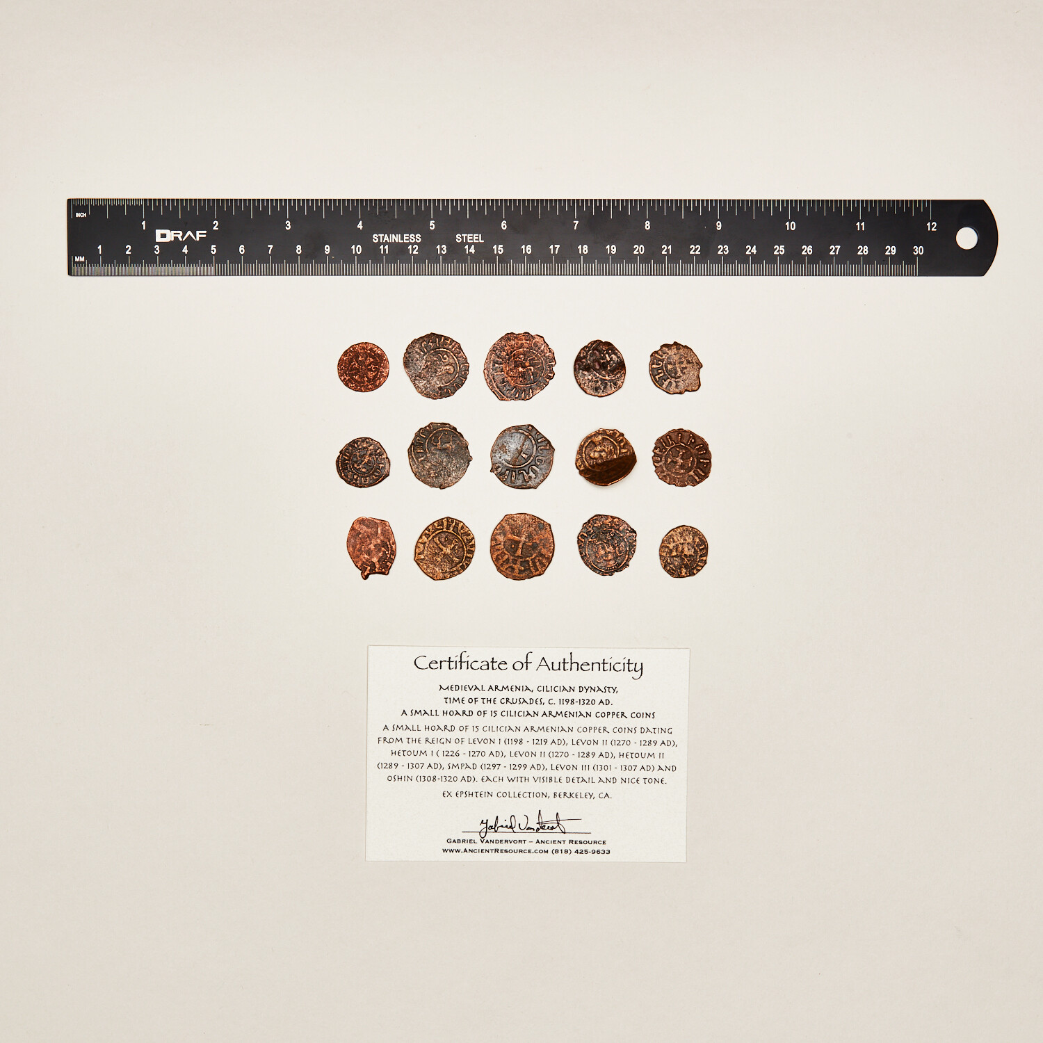 Medieval Armenia, Cilician Dynasty, time of the Crusades. A small hoard of 15 Cilician Armenian copper coins. Dating from the reign of Levon I (1198 - 1219 AD), Levon II (1270 - 1289 AD), Hetoum I ( 1226 - 1270 AD), Levon II (1270 - 1289 AD), Hetoum II (1289 - 1307 AD), Smpad (1297 - 1299 AD), Levon III (1301 - 1307 AD) and Oshin (1308-1320 AD). Each with visible detail and nice tone.