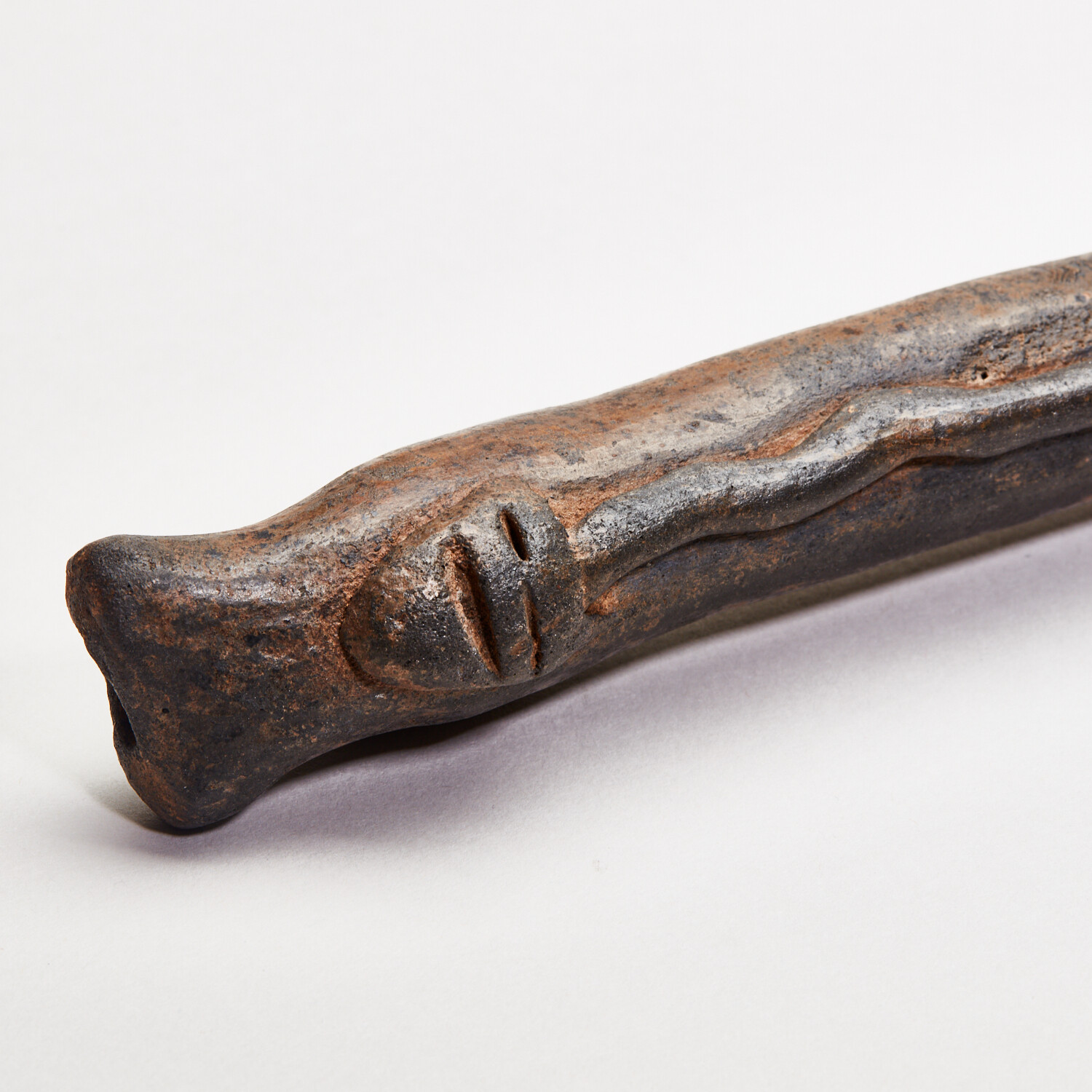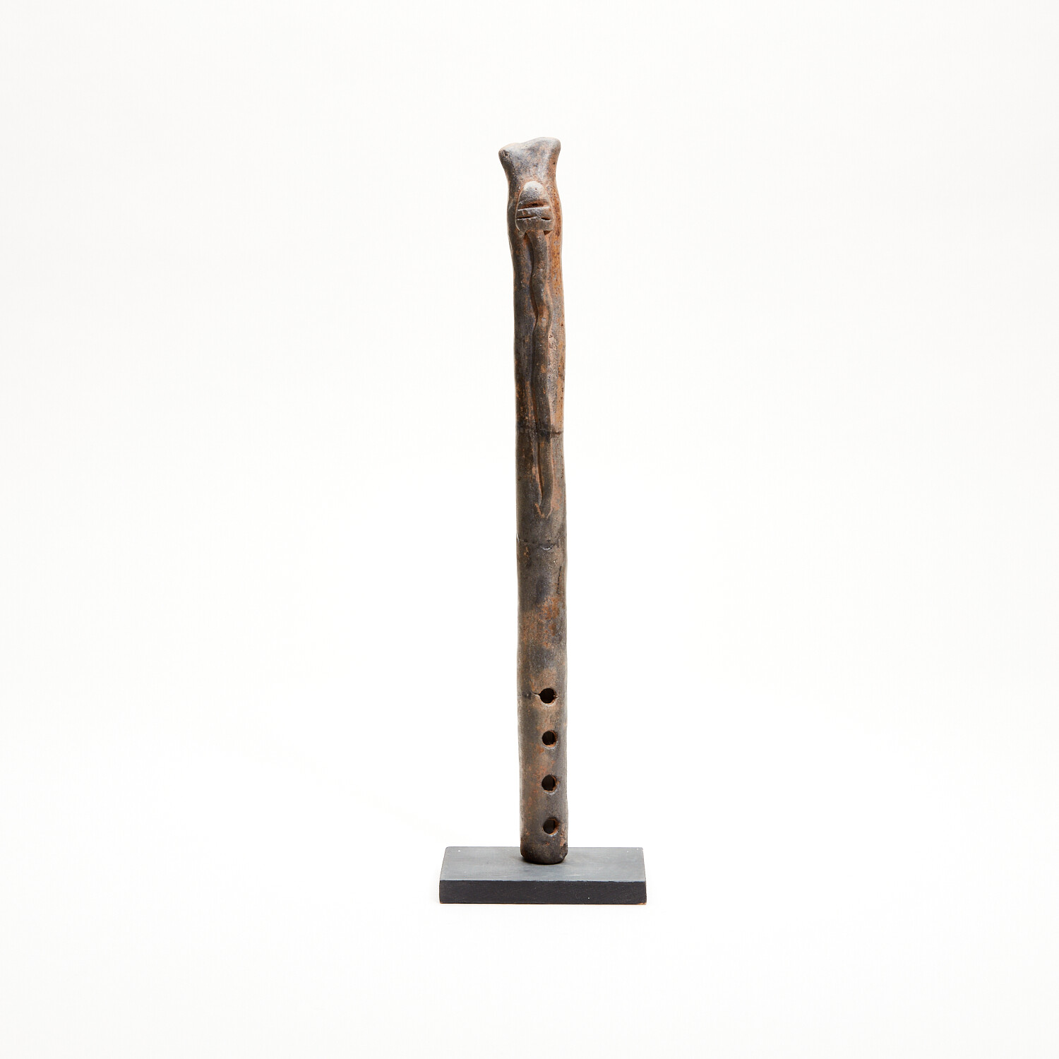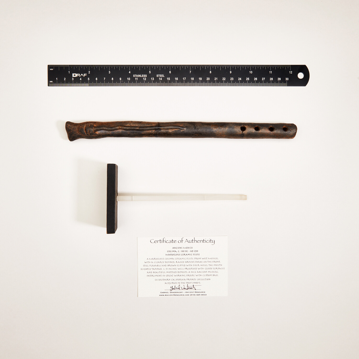 Precolumbian, Ancient Mexico. Colima, c. 100 BC - AD 250. Marvelous Colima ceramic flute from West Mexico, with a clearly defined, raised serpent/snake on the front. Still playable and brown-slipped with four holes, the mouth slightly tapered. Well-preserved with glossy surfaces and beautiful mottled deposits. A nice ancient musical instrument in great working order! Still makes a nice sound.