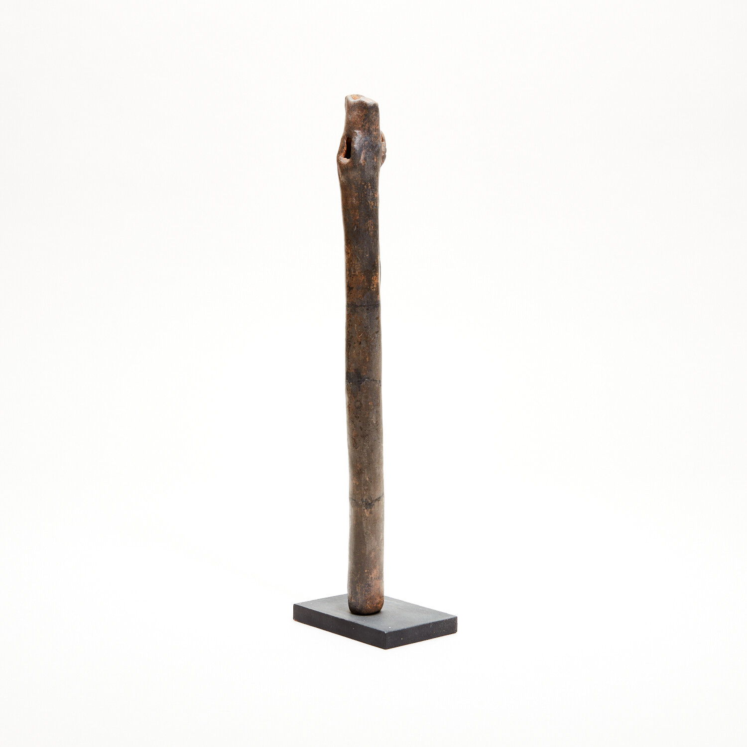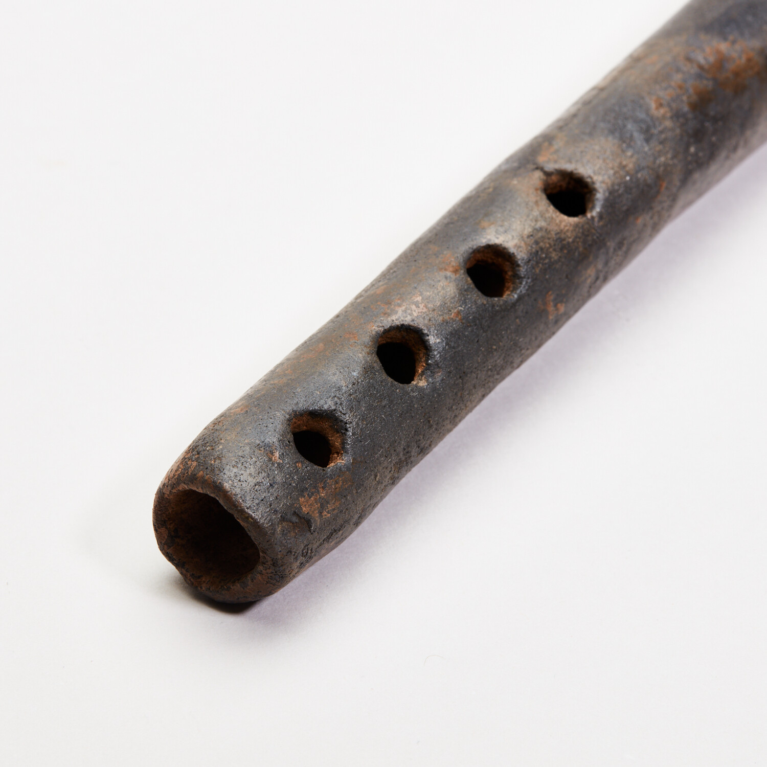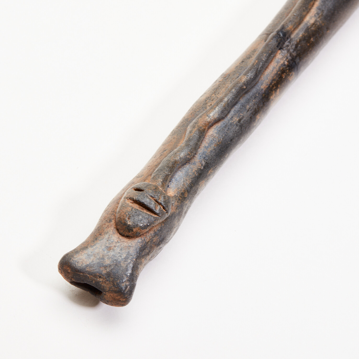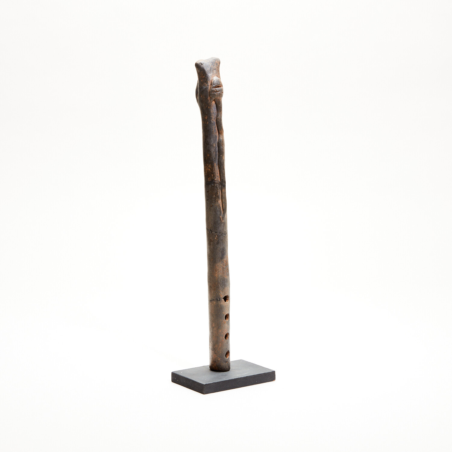 Precolumbian, Ancient Mexico. Colima, c. 100 BC - AD 250. Marvelous Colima ceramic flute from West Mexico, with a clearly defined, raised serpent/snake on the front. Still playable and brown-slipped with four holes, the mouth slightly tapered. Well-preserved with glossy surfaces and beautiful mottled deposits. A nice ancient musical instrument in great working order! Still makes a nice sound.