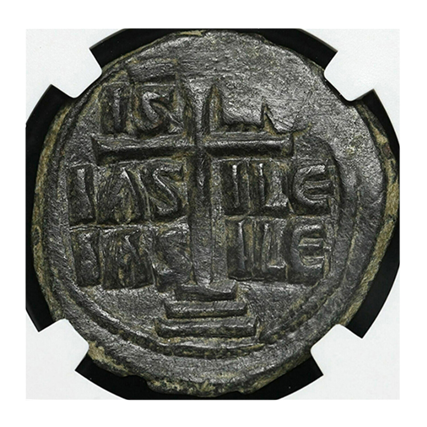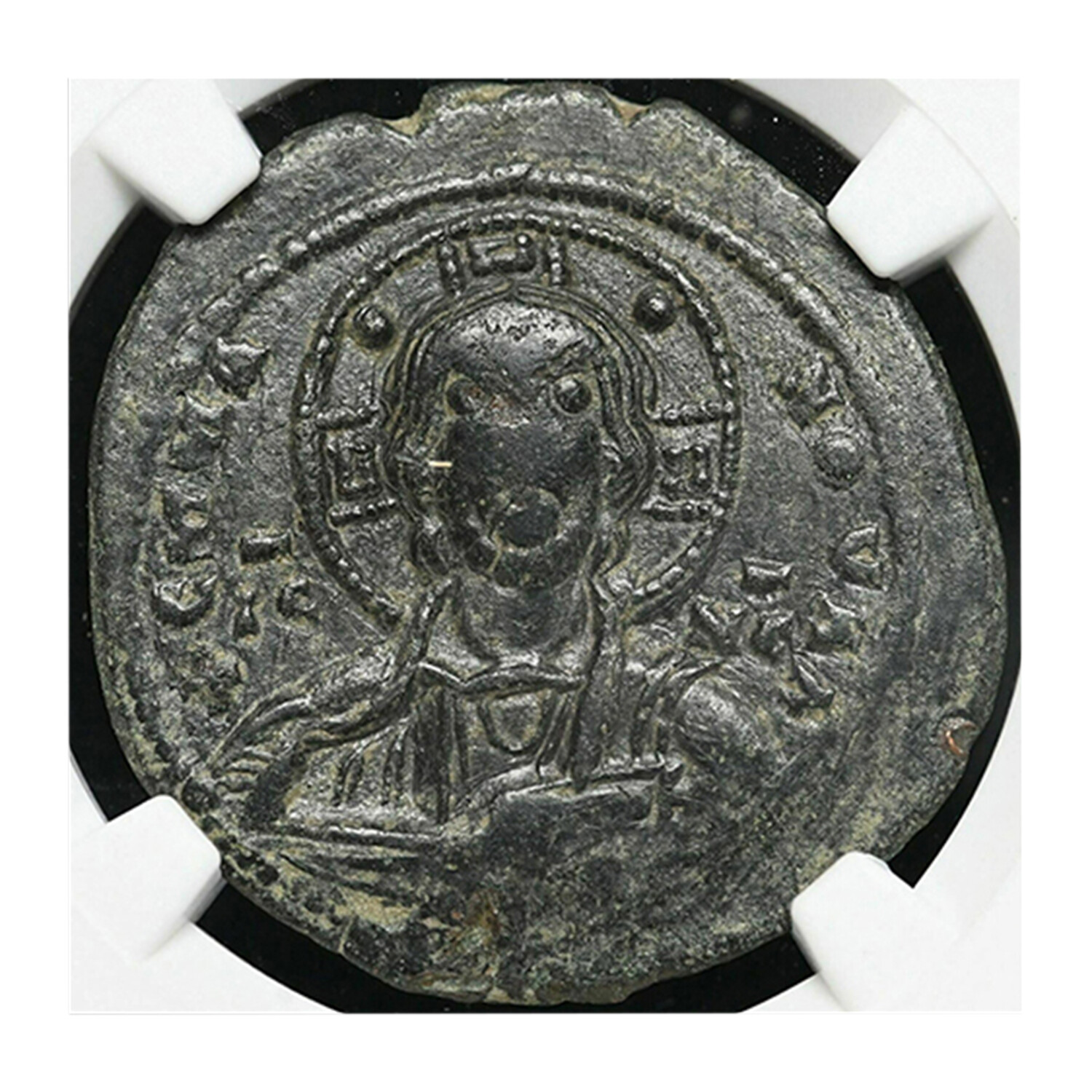 Byzantine Empire, Reign of Romanus III, 1028 - 1034 AD. Class B bronze follis. Christ facing with book of Gospels, +EMMANOVHA IX-XC around / Cross with IS \ XS above, bAS-ILE \ bASILE ("Jesus Christ, King of Kings"). Nice deep olive-green patina, nice detail. Encapsulated and graded Choice VF by NGC.