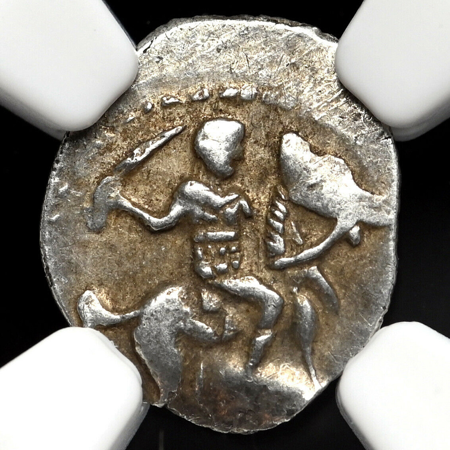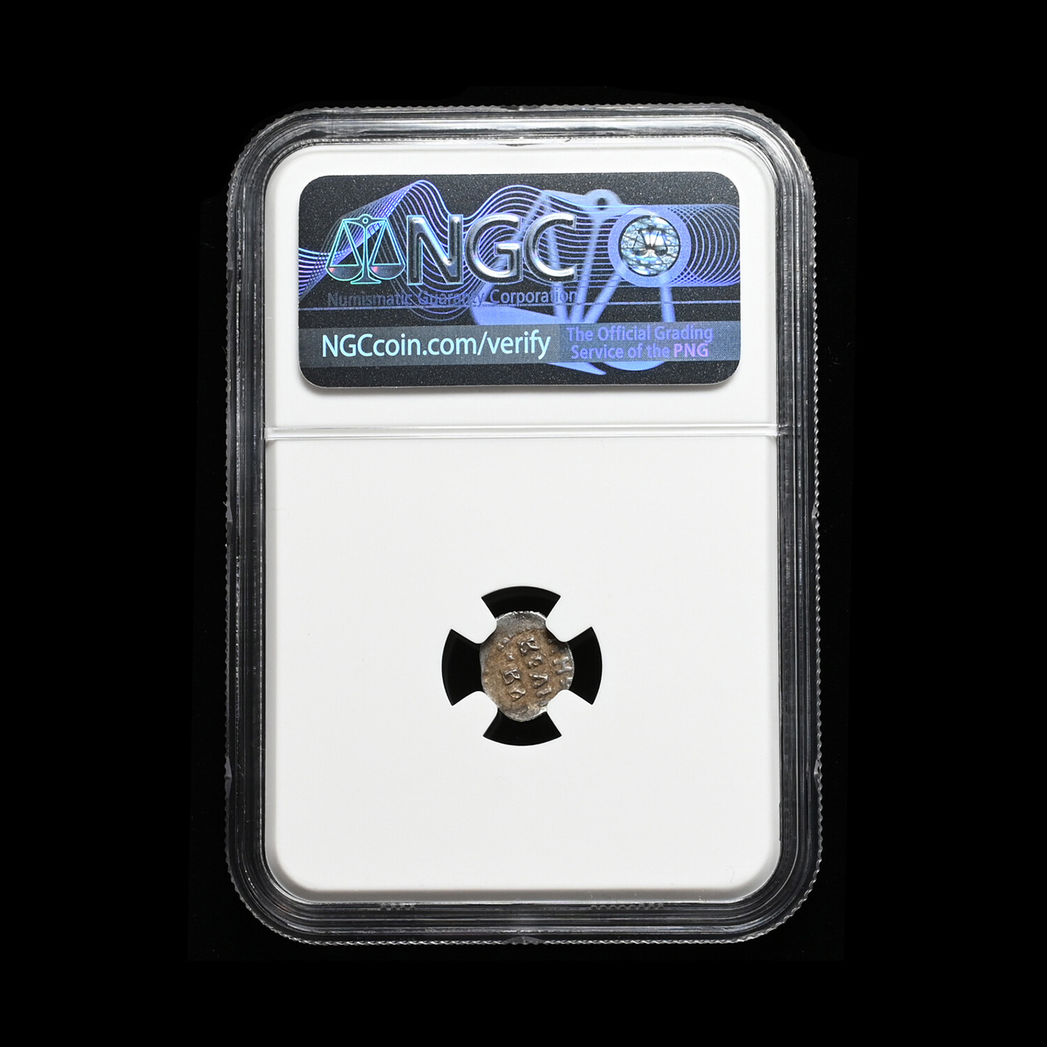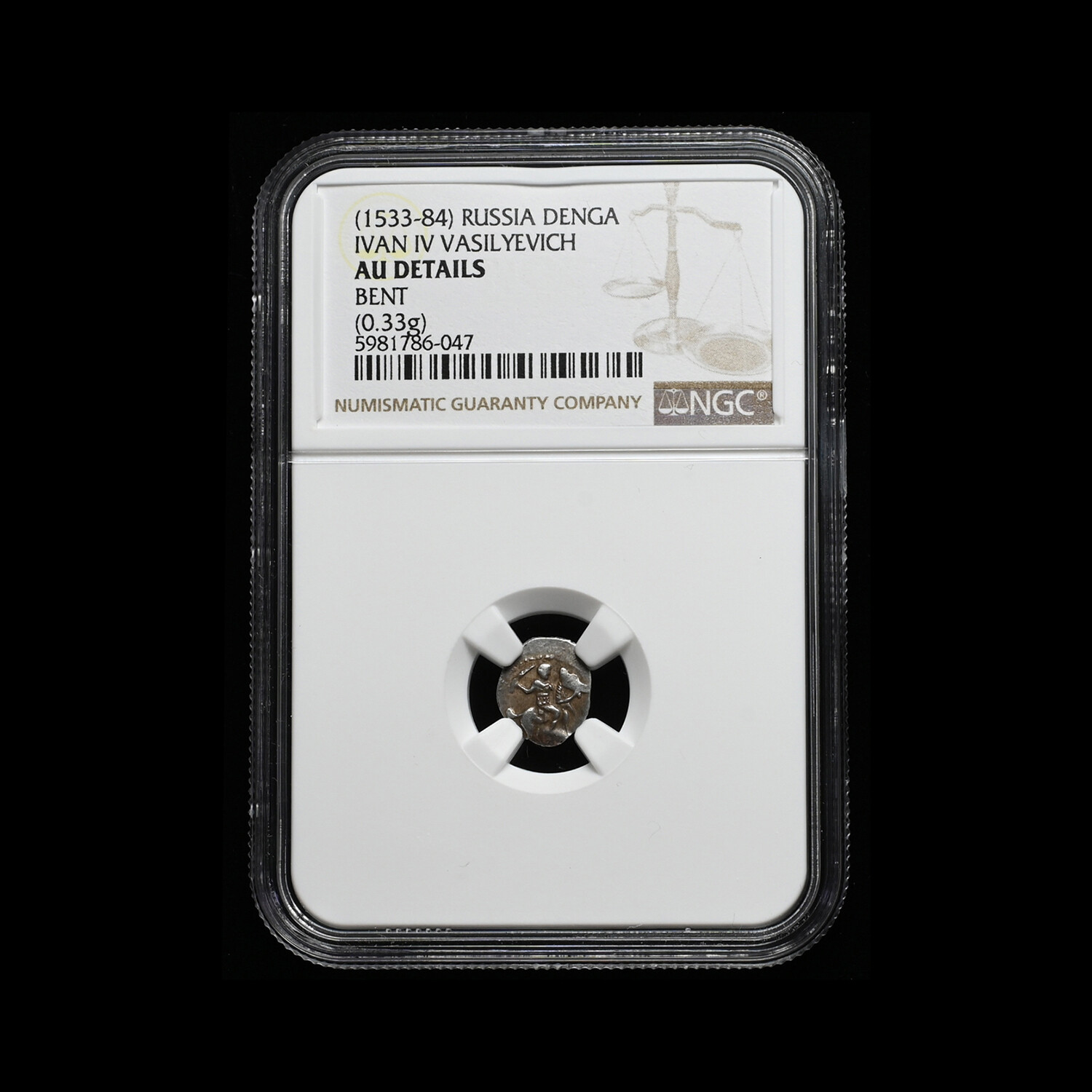 Late Medieval Russia. Ivan IV "The Terrible", 1530-1584 AD. Small silver Sword Denga, Wire money. Tsar on horseback, wielding a sword / Old Cyrillic inscription naming Ivan as Tsar of Russia. Encapsulated and graded Almost Uncirculated Details by NGC. The coin has the faintest, hardly noticeable bend, and is in exceptional condition for the type.
