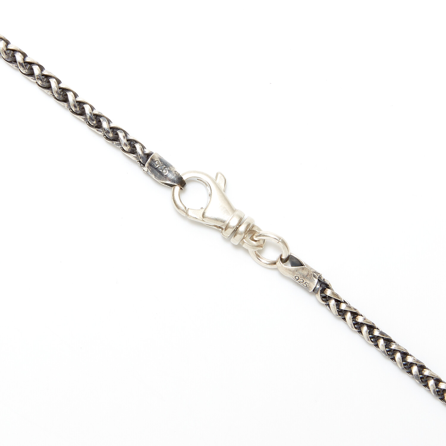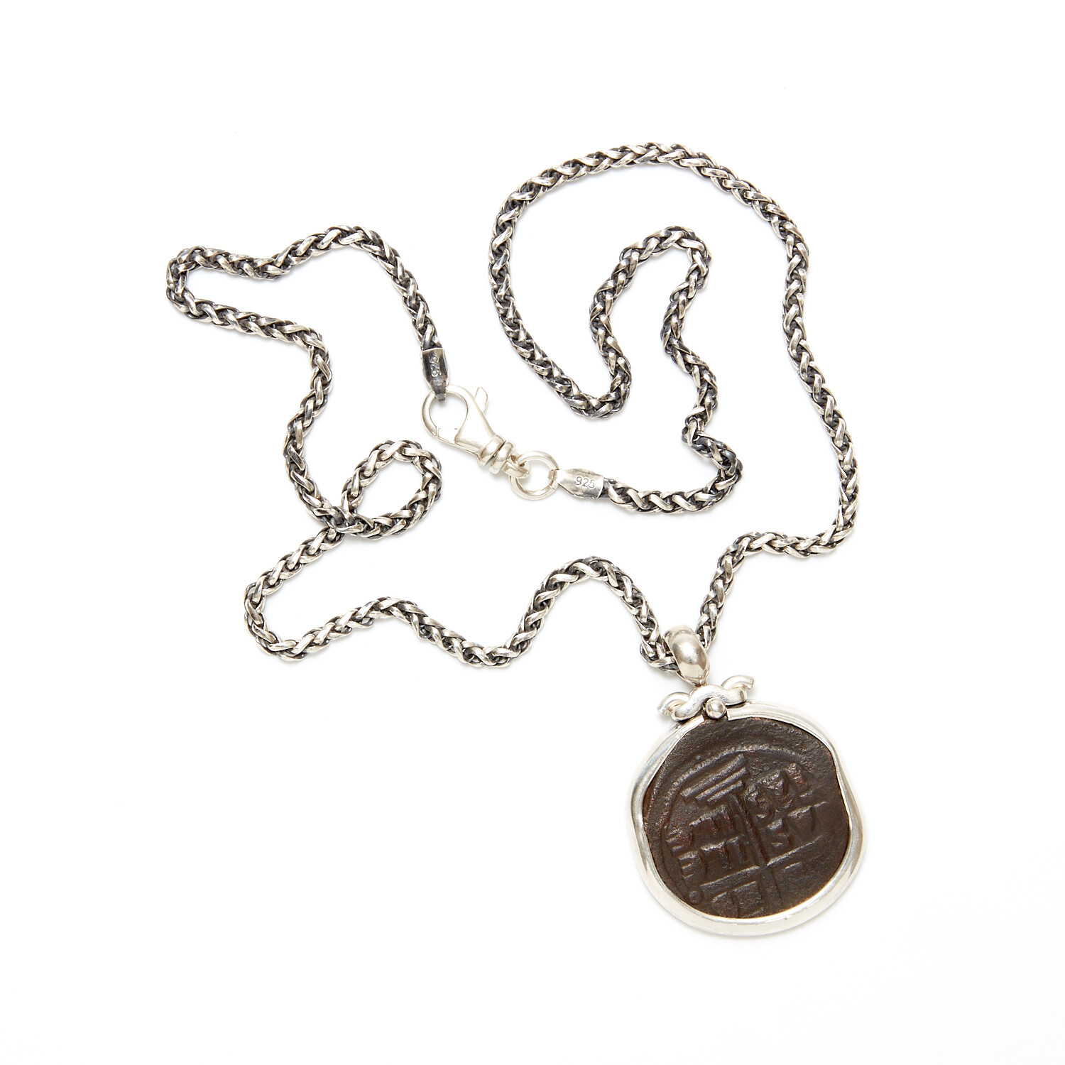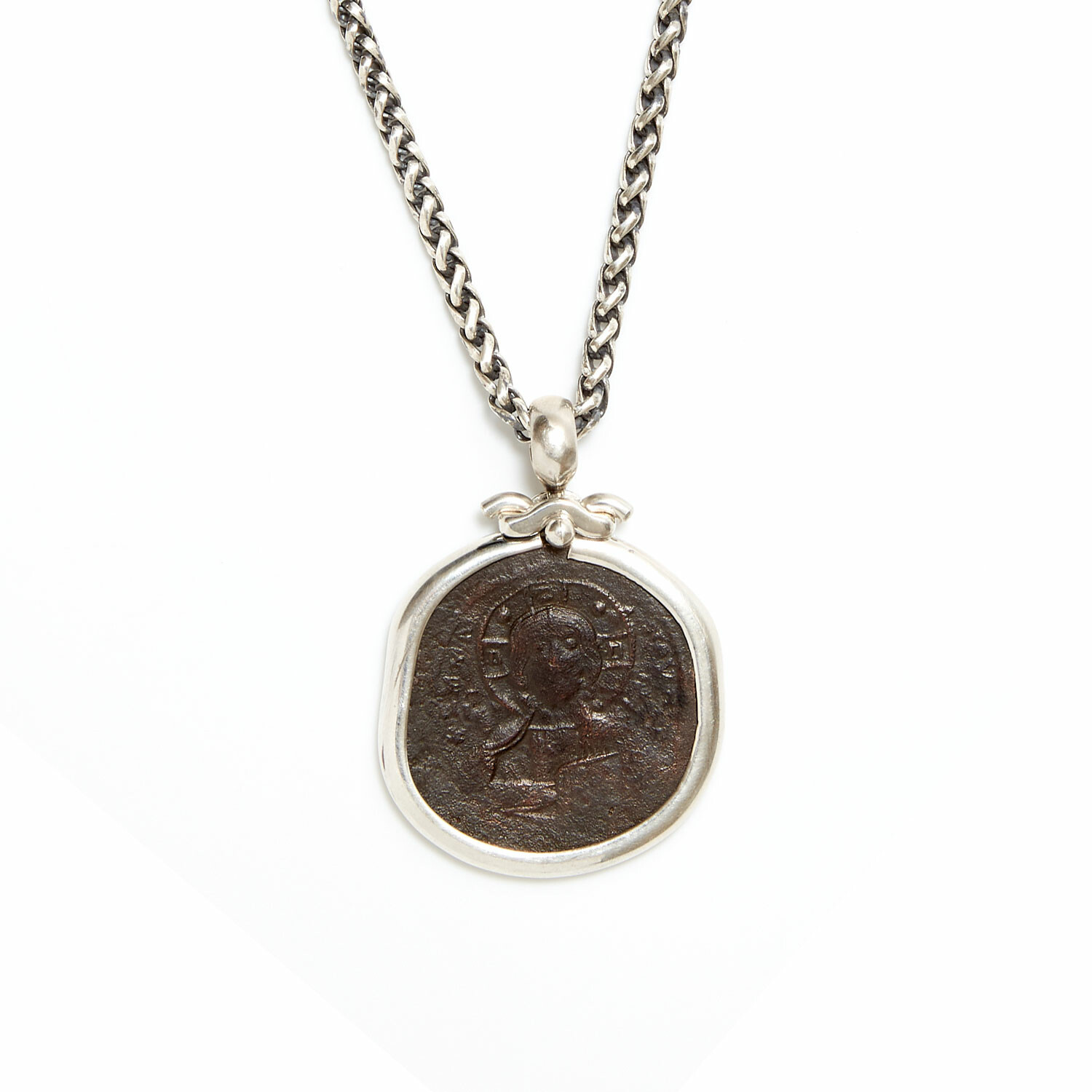 Byzantine Empire, reign of Romanus III, 1028 - 1034 AD. Class B bronze follis, set into custom .925 silver bezel and 20-inch Italian silver chain. The front depicts Christ facing, holding Book of Gospels, +EMMANOVHA IX-XC around / The back depicts the True Cross upon three steps, IS \ XS above, bAS-ILE \ bASILE ("Jesus Christ, King of Kings"). Dark patina with coppery highlights. ref: Sear 1823, DOC 676 for type. Total bezel diameter 30mm.
