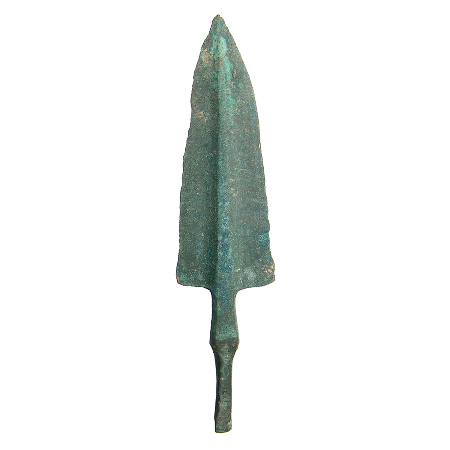 This Ancient Elamite-Luristan Bronze Arrowhead dates to c. 1200–800 BC during the Persian Bronze Age. A large and well-preserved example, it features a deltoid-shaped head with a raised central midrib and a short tang designed for mounting into a wooden shaft. Measures 4" in length. Exhibits an attractive olive-green patina with earthen and mineral encrustations. Ref: Malloy "Weapons" plate XII, #92; Muscarella #417 for type. From the highly curated Spangenberg collection, Texas (Accession number 2009.21.78).